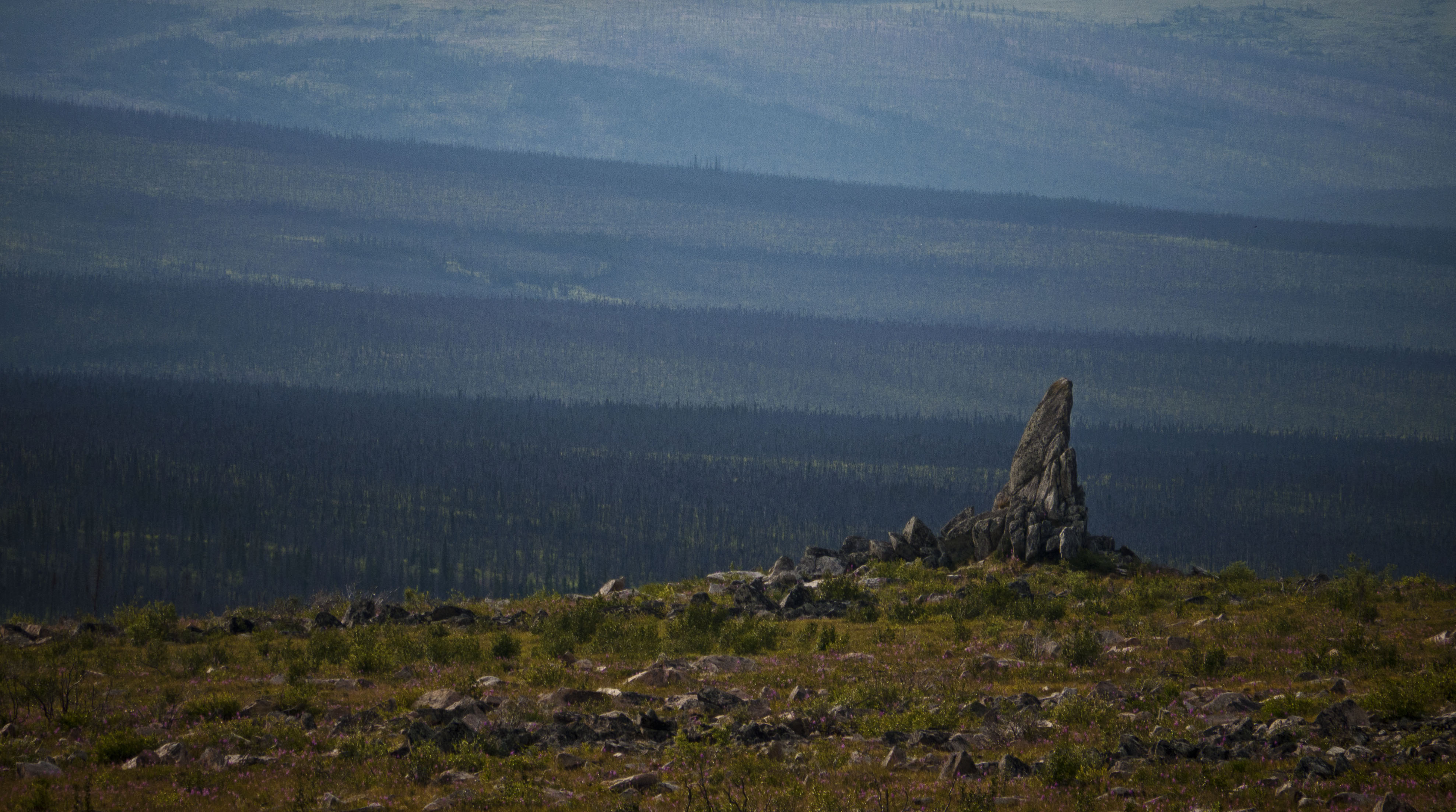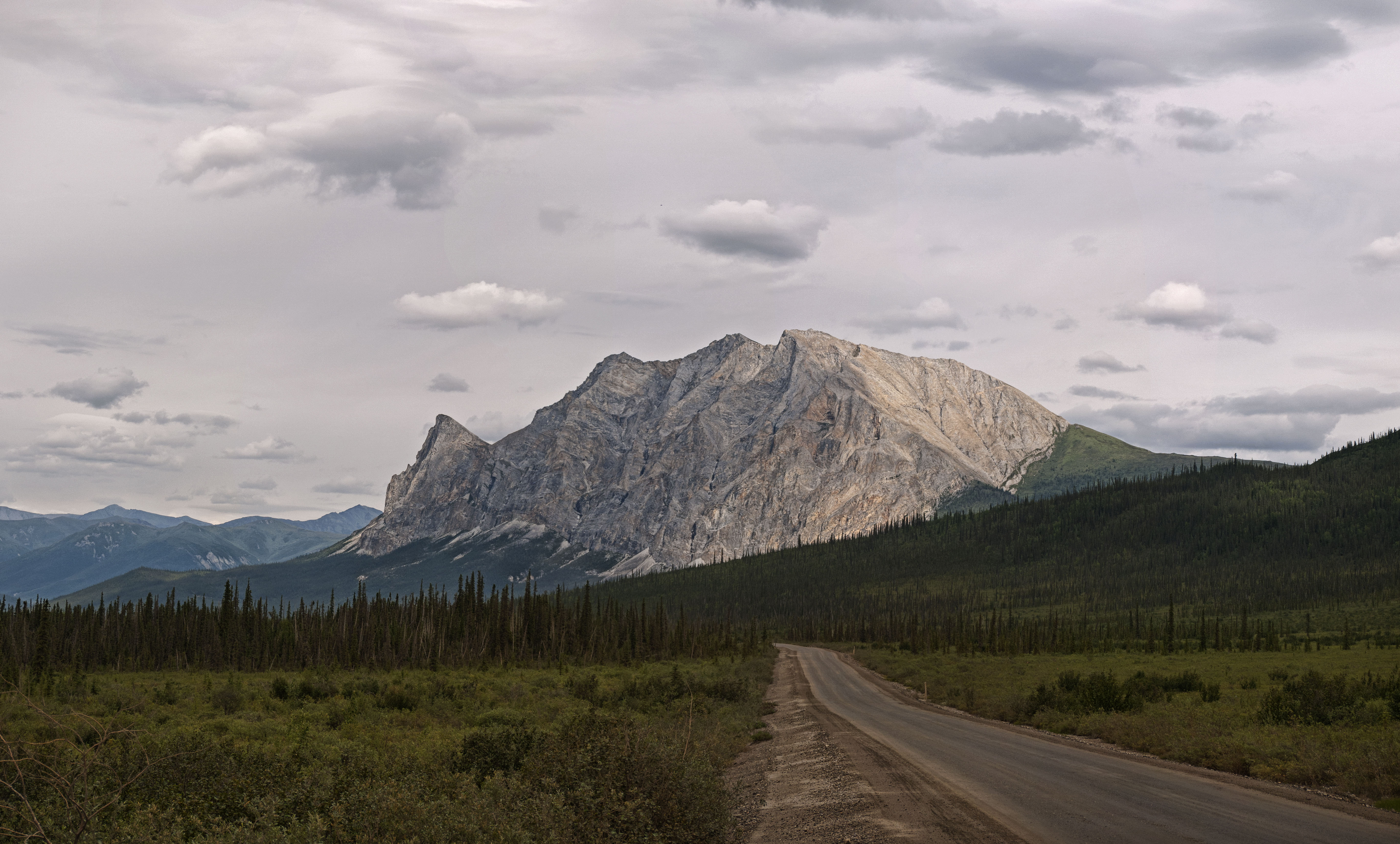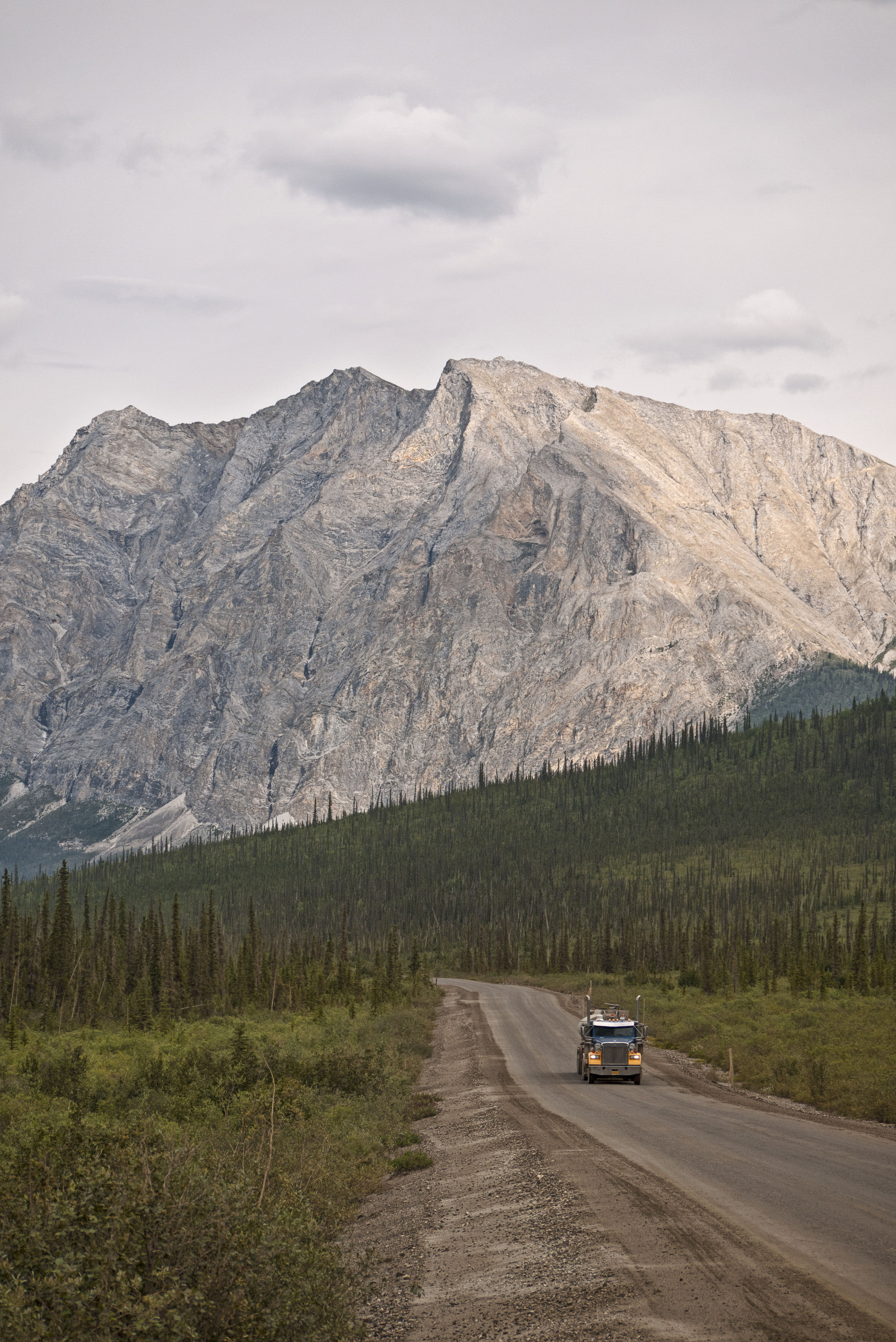 The first major landmark on the Dalton is crossing the Yukon River. The bridge is the only one downstream of Whitehorse and is 700m long. This is followed by travelling through an undulating landscape with mostly stunted trees growing in the Permafrost. The road mostly closely follws the Trans-Alaska pipeline.