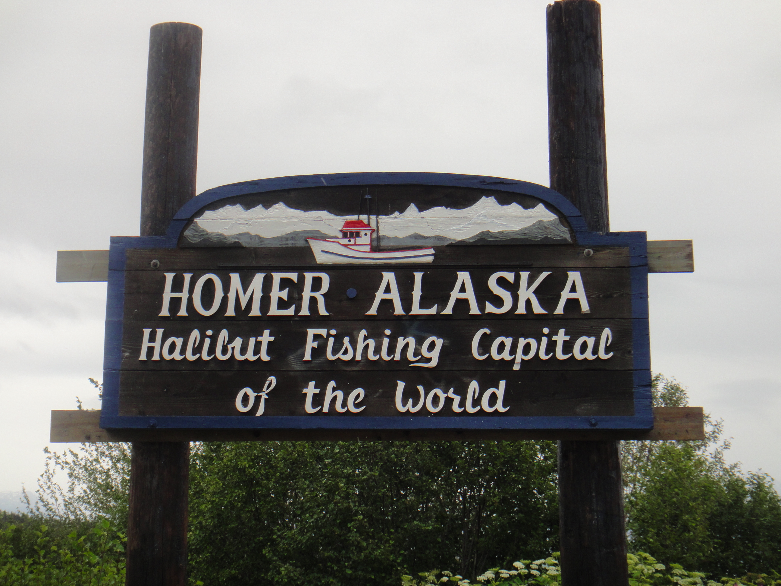I mentioned earlier that we were booked to do an overnight kayak trip. Well the weather really came in, bringing driving rain and 15 foot seas so the trip was cancelled. We figured that was it for Seward and we left looking for better weather. We headed across the Kenai Peninsula to Homer which is another small town with its distinguishing feature being a 4 mile long split into the Ocean which has a harbour and a whole host of fishing and tourist related shops.