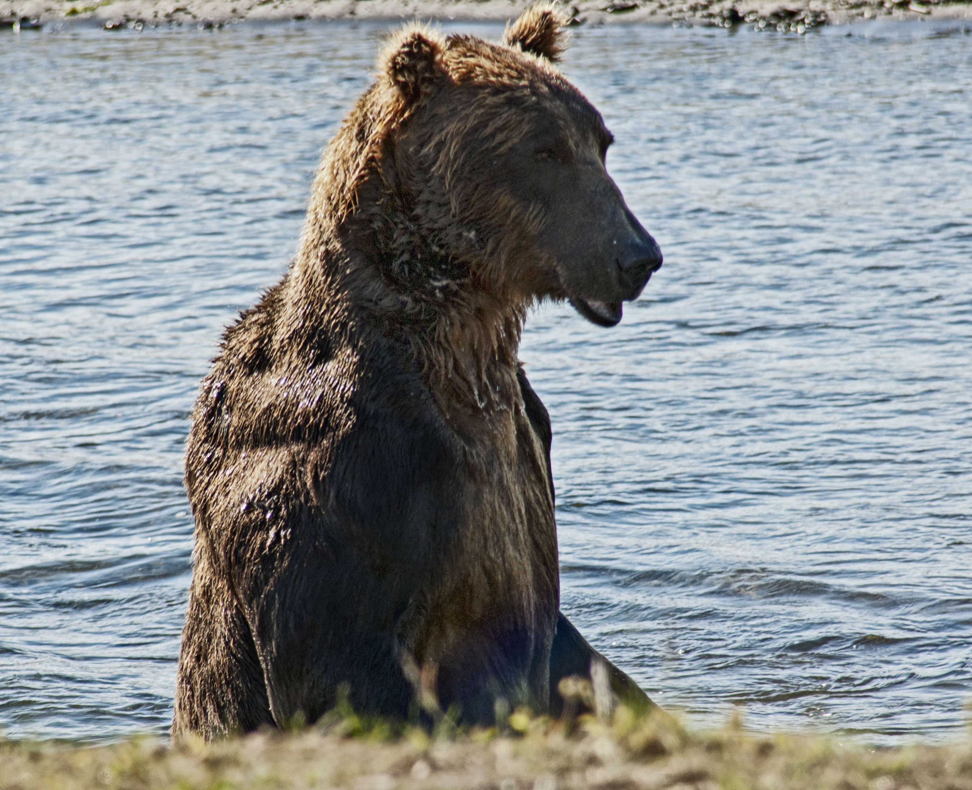 This day couldn’t have been more different. The sky was blue, the sun was out and so were the bears. Within 100m of the camp we came across a bear sitting on the beach have a cat nap (or should that be bear nap?) We sat and waited for him to move off down to the creek and we followed some distance behind, moving to the same log as the previous day.