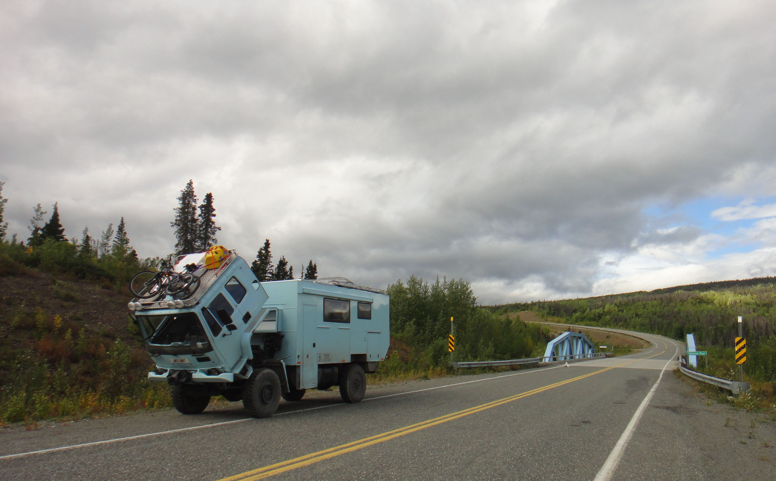 More waiting then another Yukon Highways Agency truck arrives with a chap called Paul onboard. He was our lifeline as he offered us a lift to Haines Junction so that we could arrange a tow. We arrived in Haines to find that the tow truck was out of service. We phoned a towing service in Haines and they need special customs permission to come to Canada. So we were left with arranging a tow from Whitehorse (150 miles) away. Once this was sorted Paul gave us a lift back to the Beast where we settled in to wait.