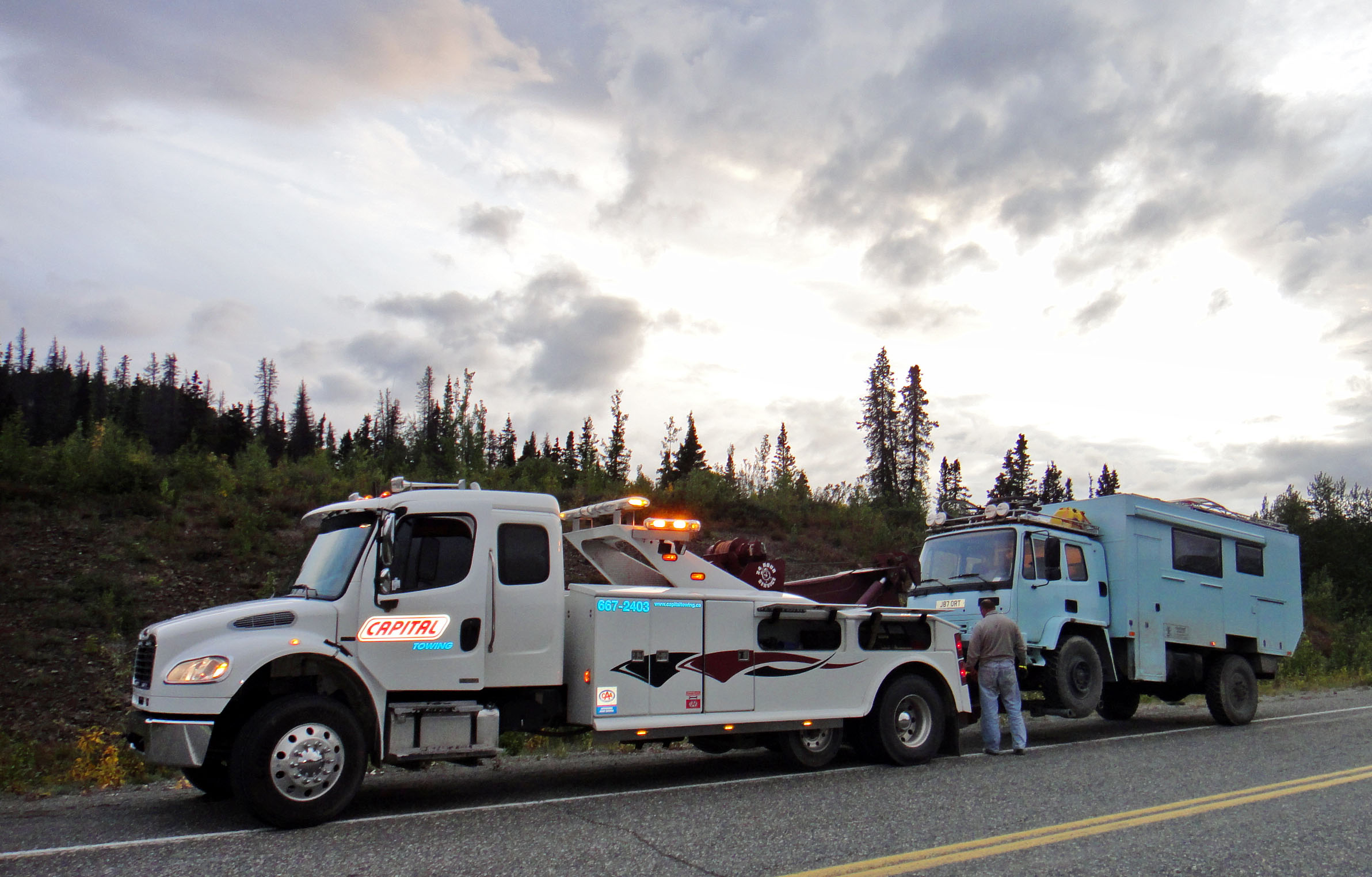 Around 9pm the tow truck arrived. It was a slick process making a cradle for the front wheels and lifting them free of the ground. The back drive shaft to the rear wheels needed to be removed and air lines attached to brackets at the front (and we thought we would never use them) to make sure we could release the brakes. Then we were off for a 3.5 hour journey to Whitehorse. The real shocker is the CAD$1600 cost of the tow. Ouch !