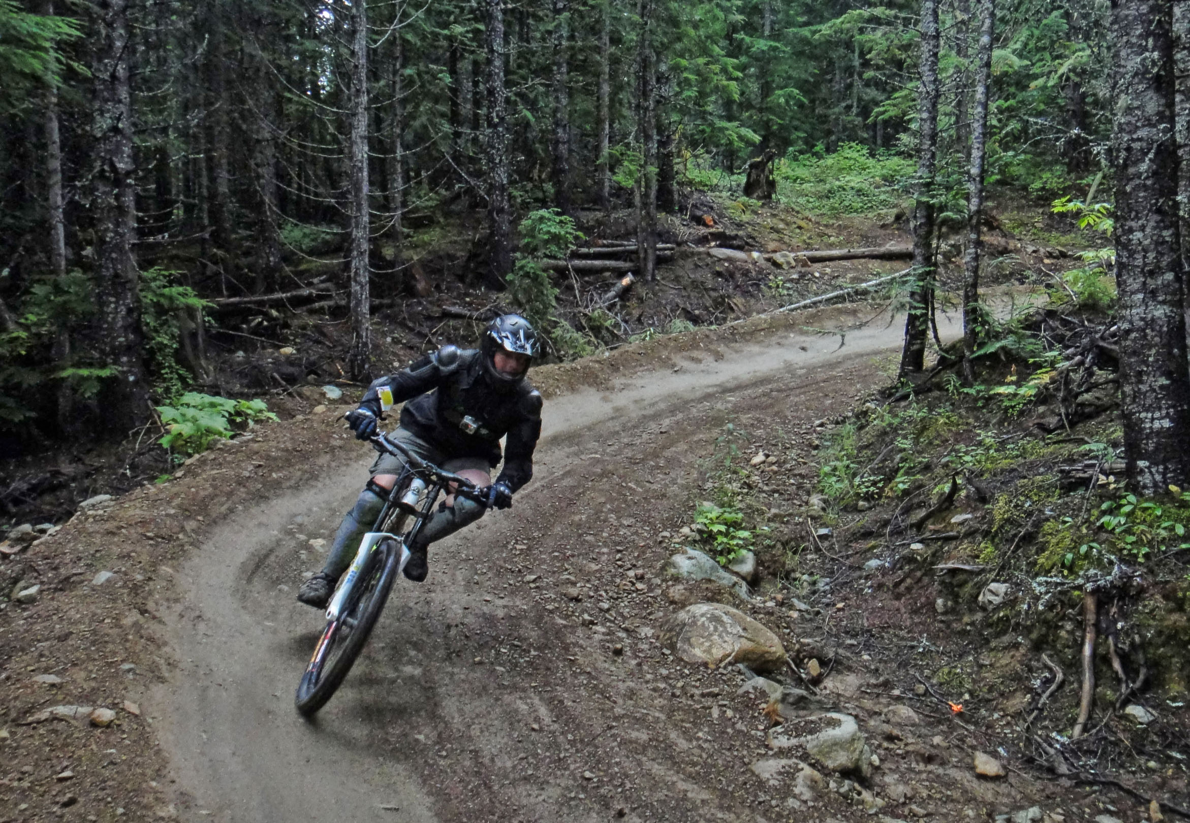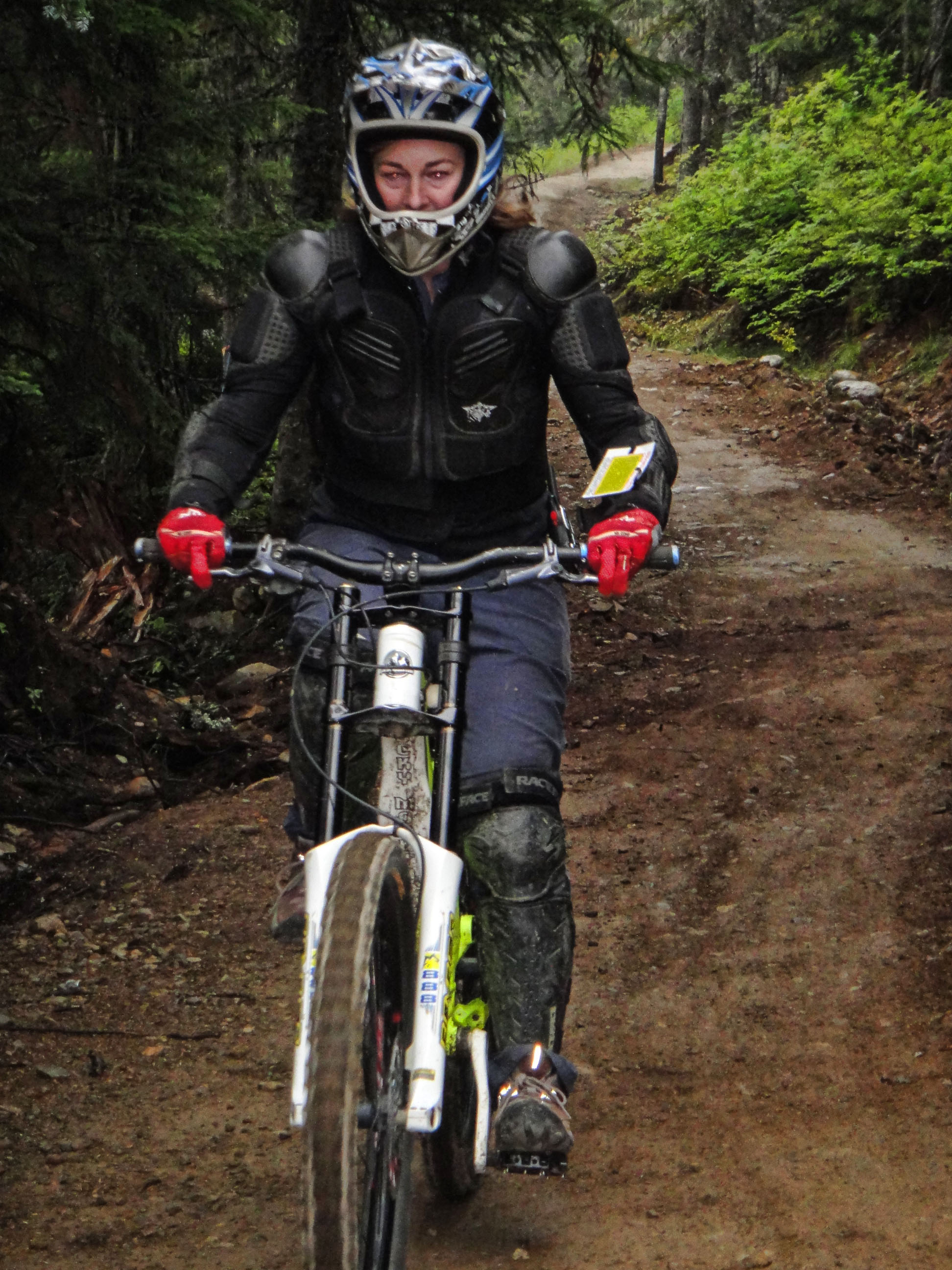 For my last run of the day I thought that I should try a black. Wow this is much harder. The key to success is to maintain your pace but that was my downfall. Coming up to a dropoff of about 1.5m I came into too tentatively. My front wheel dropped and when I hit the ground I went flying over the handlebars landing hard on my head, knee and hip. Thank god for the armour – because even with armour the fall still hurt. Without a proper helmet I would have been concussed. Good thing this was the last run of the day because it killed my confidence but I would really love to try it again.