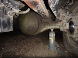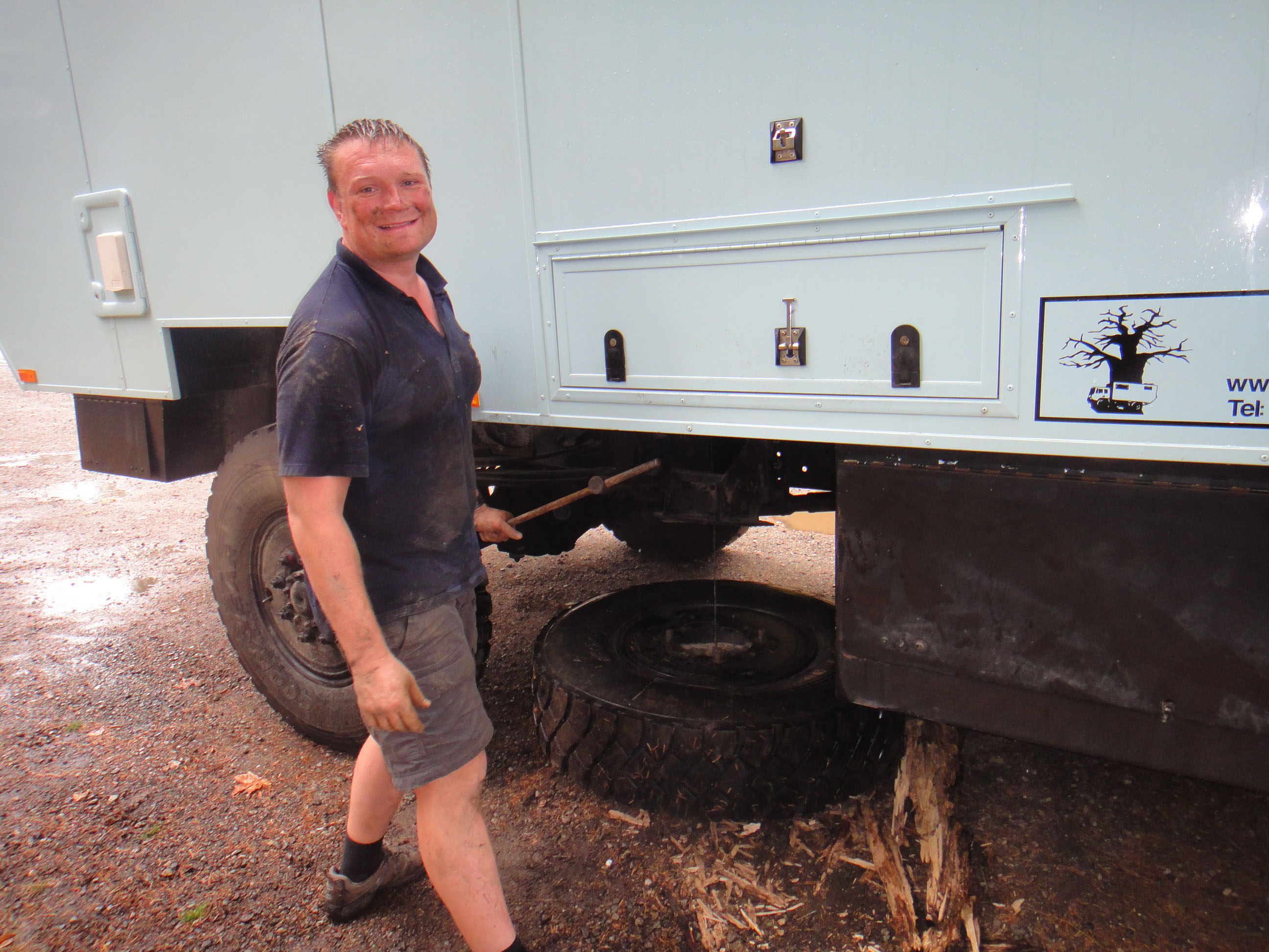 We have two spare tyres – one under the truck on a pulley system and one on the back with a winch to get it down. Well we soon discovered that the one on the winch was bolted on with bolts which we didn’t have the right size spanner for. Fortunately the other one was bolted on with nuts the same size as the tyre ones – good design.