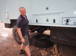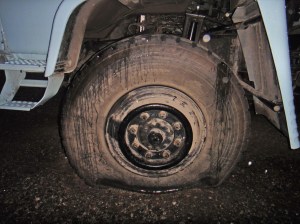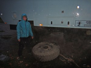 With the dark gathering quickly we got out our jack and placed it under the axle to provide some support. There was no way that we were going to change the tyre that night though. I did test the lug nuts though to make sure that I could turn them – and all of them turned – that was a serious relief. We spent an anxious night – moving around very gently to make sure we didn’t knock the truck off the jack – before resuming at first light. Although just our luck it was pouring with rain in the morning.