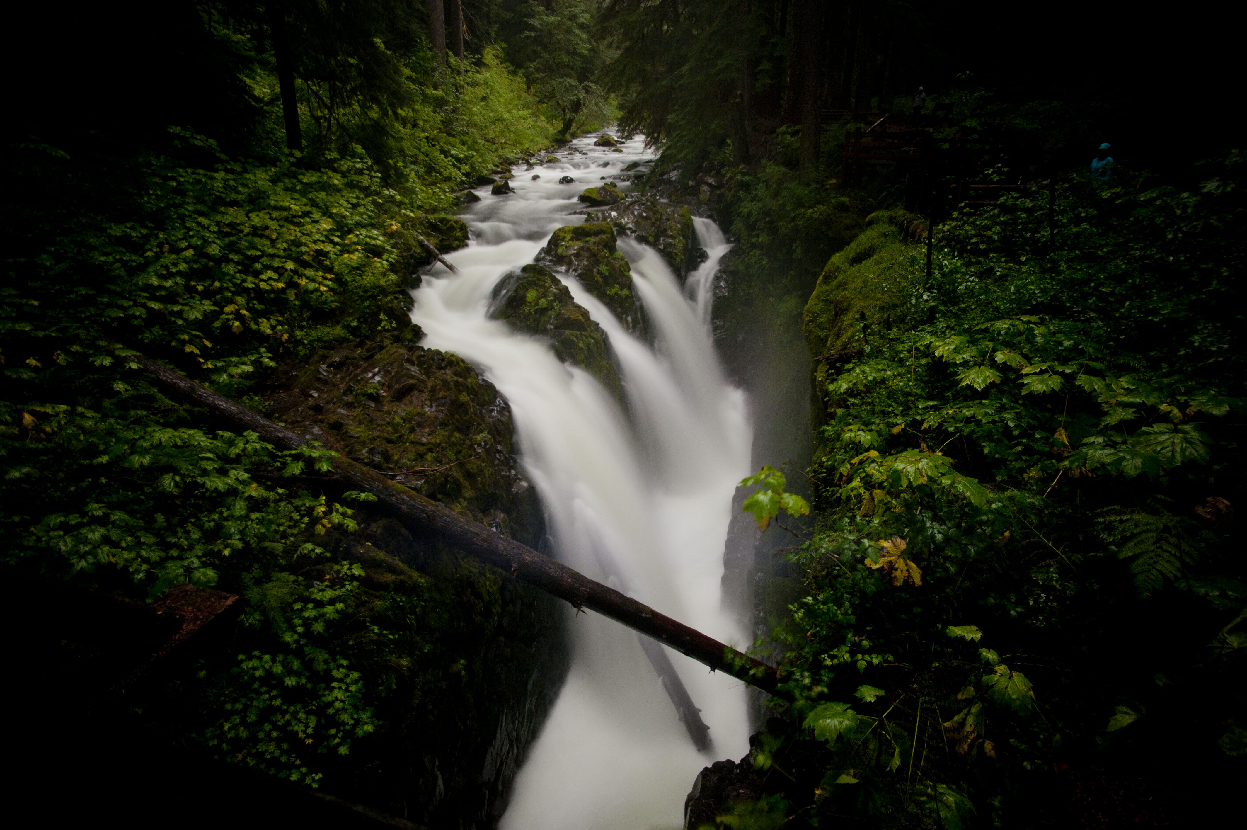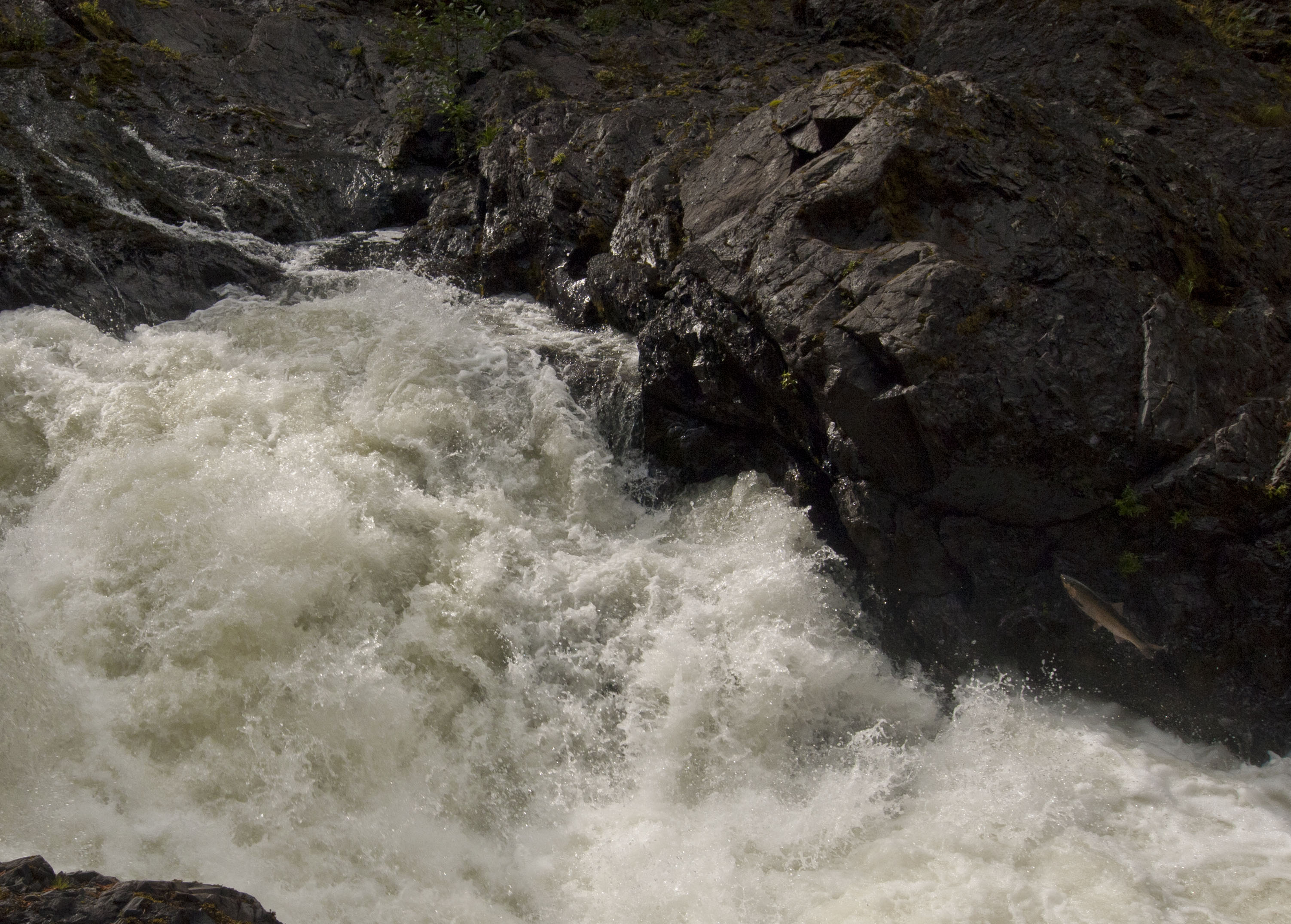 After this we drove to a trail head to the Sol Duc falls which was a walk through rainforest to a bridge over the gorge just down from the falls. It started raining soon after we started and stopped just before we got back to the car. Driving away from the falls we drove past a river where we stopped to watch Salmon battling their way up a waterfall and rapids. They would often make it half way up with a massive amount of effort and then would be swept back down.  There is a salmon flying through the air in the picture below, against the rocks, if you can make it out.