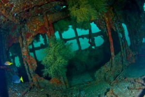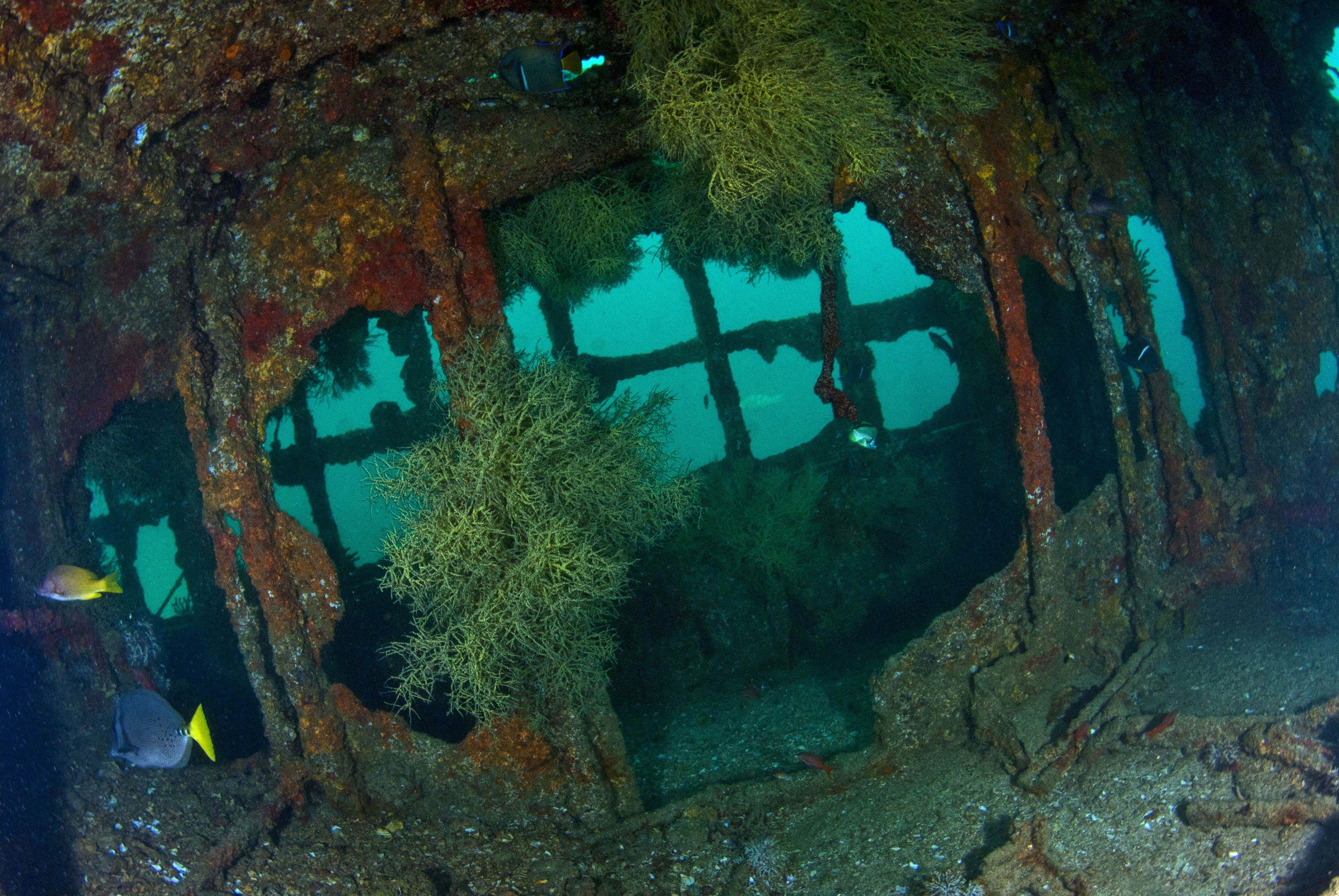We had a spot of lunch back on the boat before heading off to the second dive site which was about 30 minutes away. This was the wreck of the Salvatierra – a ferry which sank around 30 years ago. We followed the anchor line down through the murk to the wreck which has been pretty flattened by the summer storms they have here. Visibility was only around 7m. The wreck was pretty and covered with fish life which made a good second dive. I particularly enjoyed penetrating the one part of the wreck that was still standing and moving down a corridor with a lattice work of windows to the open water.