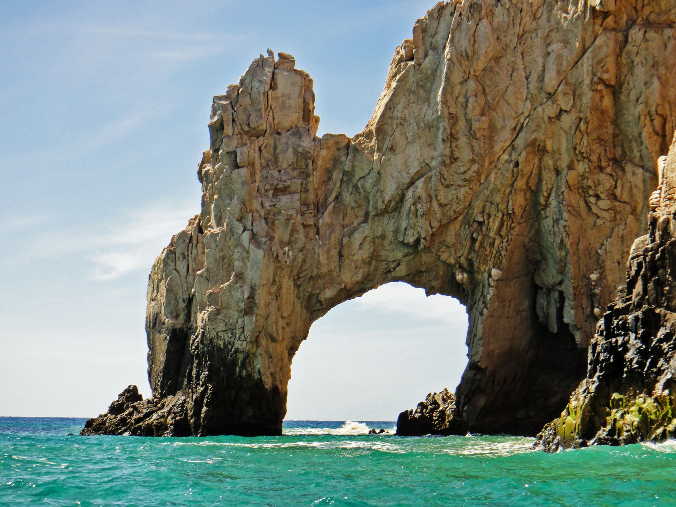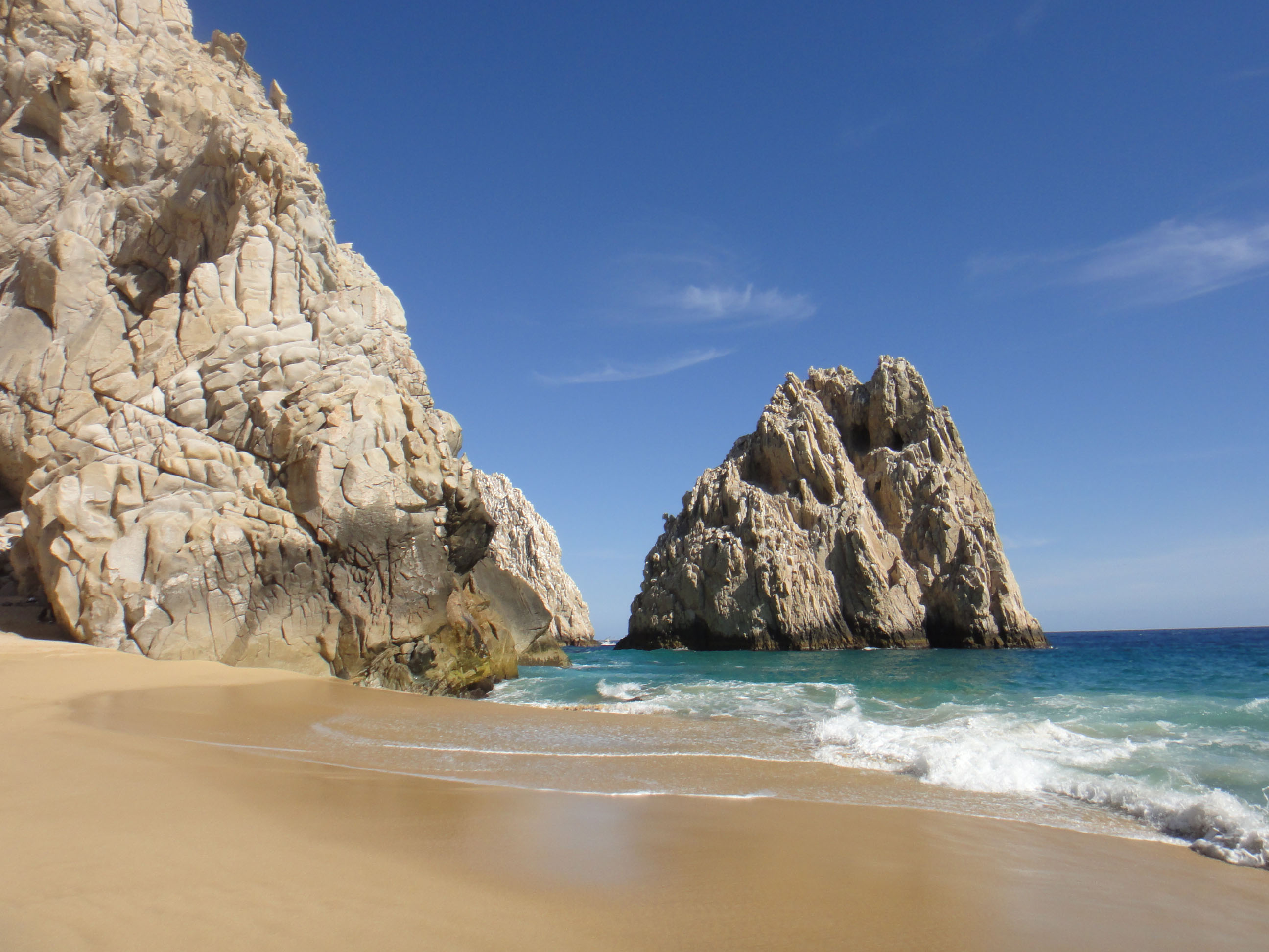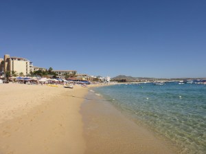 From the campsite we decided to drive into town and get our bearings. Cabo was ok for us as the roads were all of a decent size and we didn’t get stuck. We didn’t find much in the way of parking though so drove a bit out of town and stumbled across a big open car park right next to the beach. This was where all the local workers park who worked on the beach and in the adjacent hotels. We hit the beach and found that as we walked along we were getting a lot of hassle from various hawkers – even being offered 2 for 1 margaritas at 10.30 in the morning ! We decided to take up one offer of a water taxi to one of the local sights called Playa Amor (Lover’s Beach).