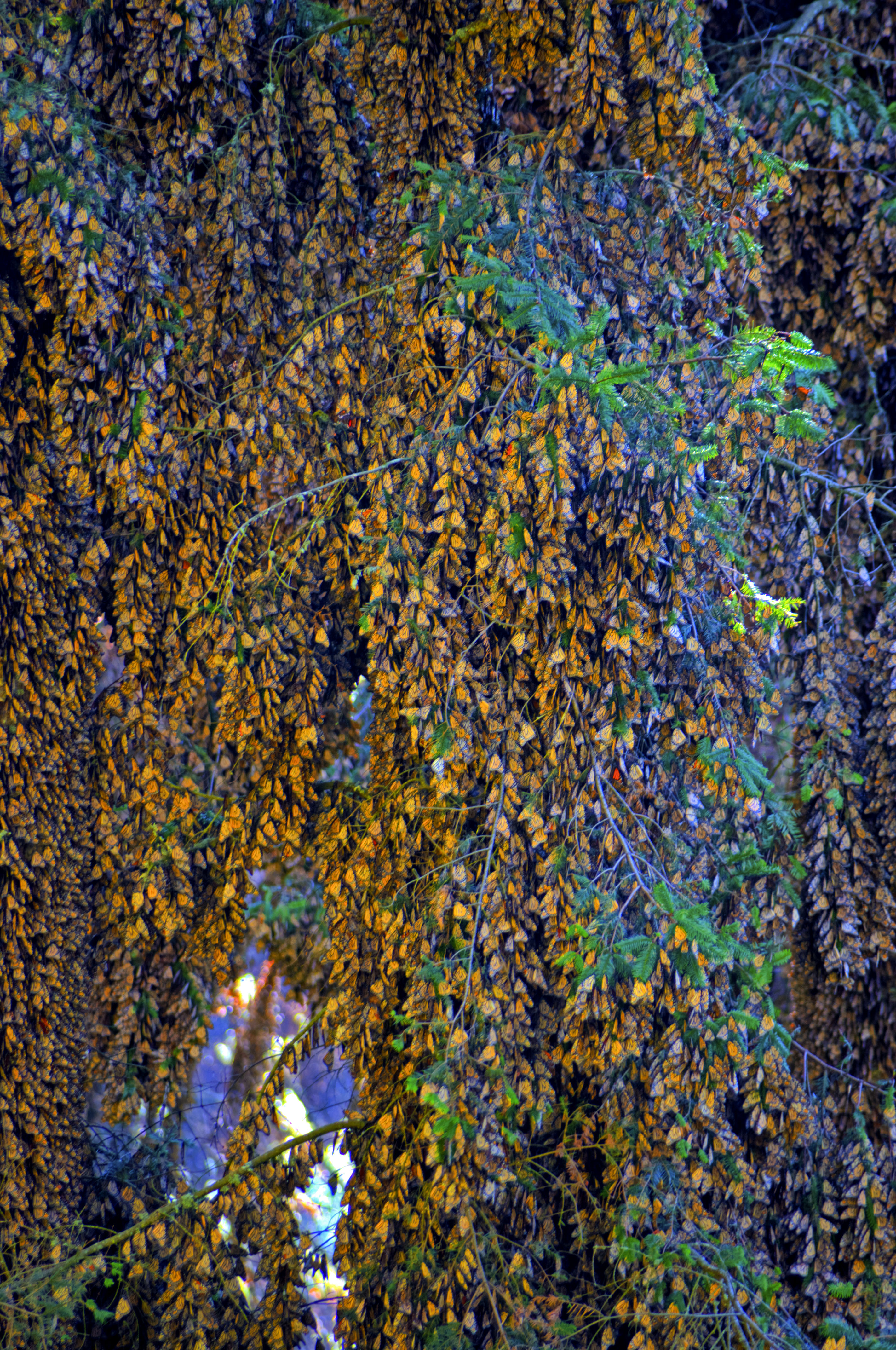 When you arrive at your destination there is yellow tape showing you how far you can go and then a bunch of trees. At first glance you can’t see anything but as you look at the trees you realise that what you thought were clumps of leaves are in fact massive clumps of butterflies. As you continue to look you realise that the trees are literally covered in millions of butterflies hanging on the trunks, branches and each other.