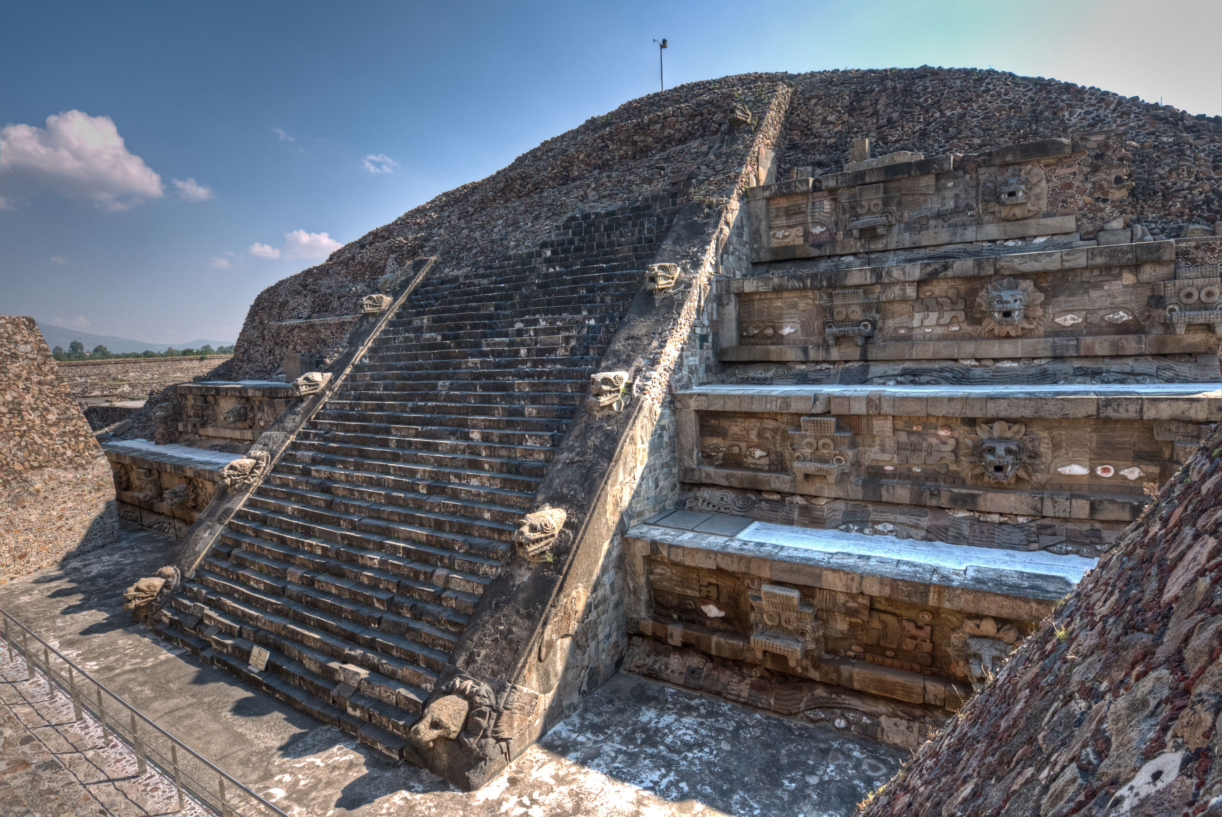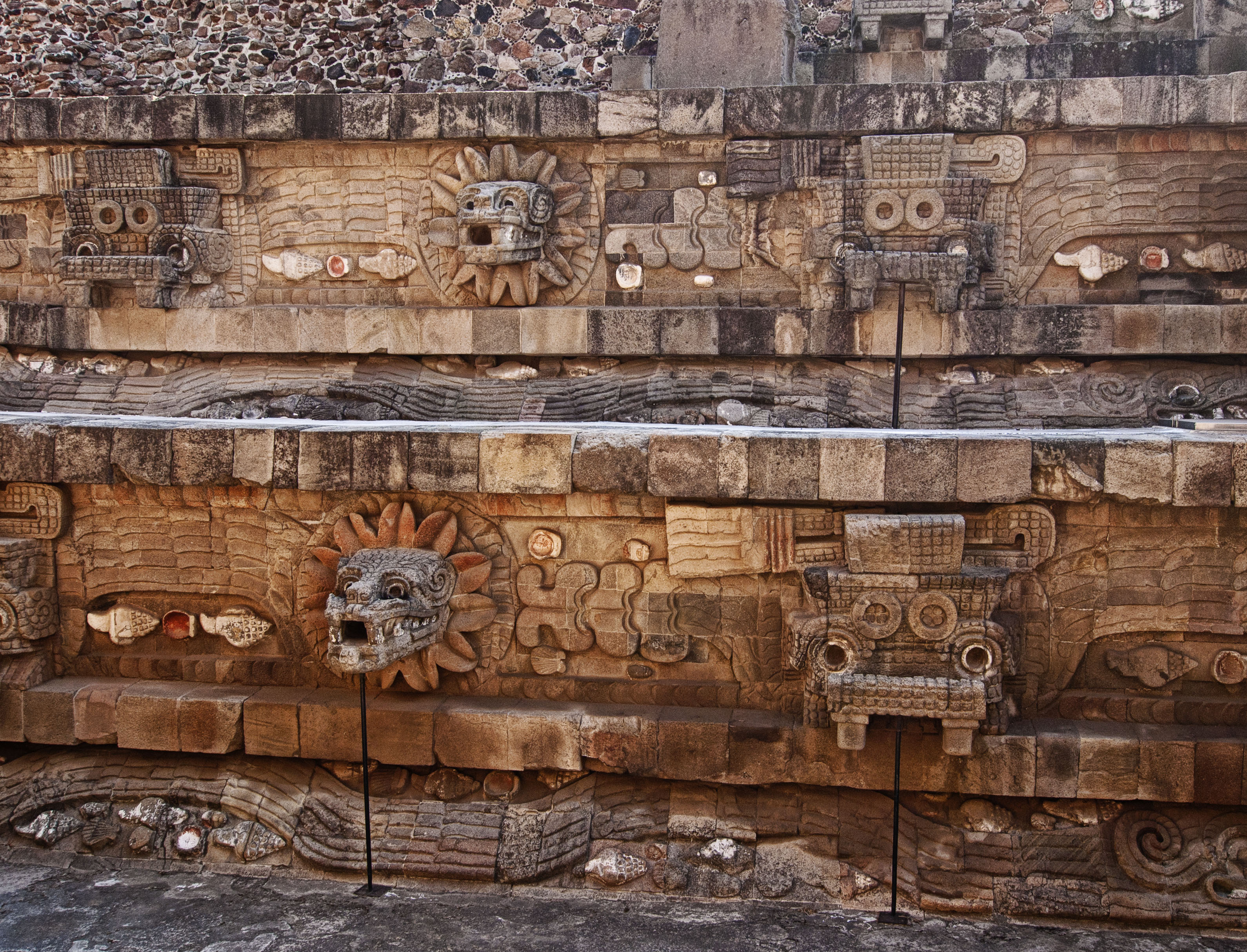 The main features are heads of Quetzacoatl, the plumed serpent, and Tlaloc, the rain god. These carvings were originally hidden by a bigger pyramid built over the top but have now been excavated.