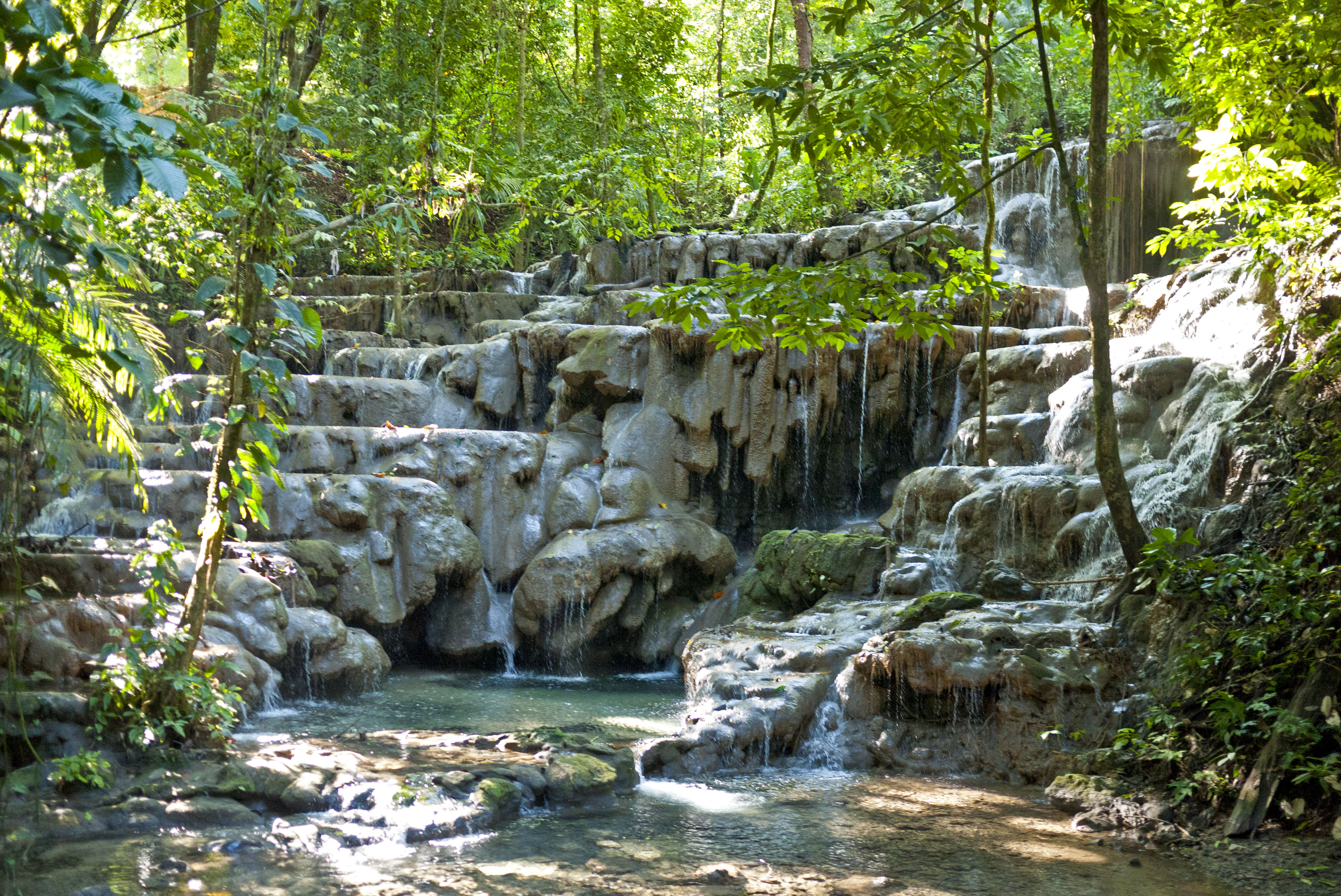 The ruins continue down into the jungle as you walk down the hill, passing a number of jungle waterfalls. The exit from the site is conveniently only 200m from Mayabell.