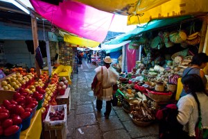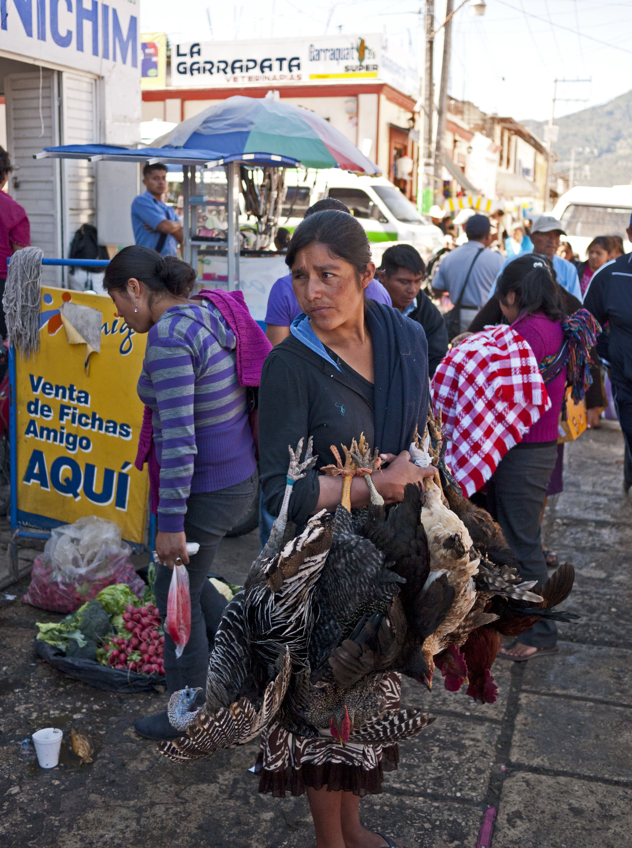 There is a really big market in San Cristobal (Mercado Joe Castillo Tielemans) in a network of small streets covered over with tarps. All the standard things like chicken, fruit etc are sold here but also more esoteric things like sheets of dried fish and cow’s faces. There were of course the obligatory live chickens and turkeys. Lots of the people in market were the indigenous peoples from the surrounding mountain villages – the women wear brightly coloured tops and fluffy skirts while the men wear Panama hats and fluffy sheepskin ponchos !