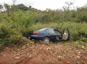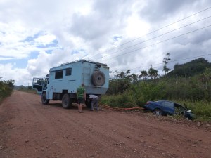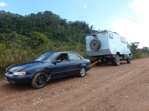 The next morning we headed off to see some of the southern end of Belize. This involved driving down an unpaved road (the Manatee Highway) towards the coast. About half way along the road we were flagged down by a guy who had managed to drive off the road and was now thoroughly stuck. We offered to pull him out which was fairly short work for the Beast. We then had to jump start him from a spare battery before he could get going. He seemed pretty unphased by the whole experience.