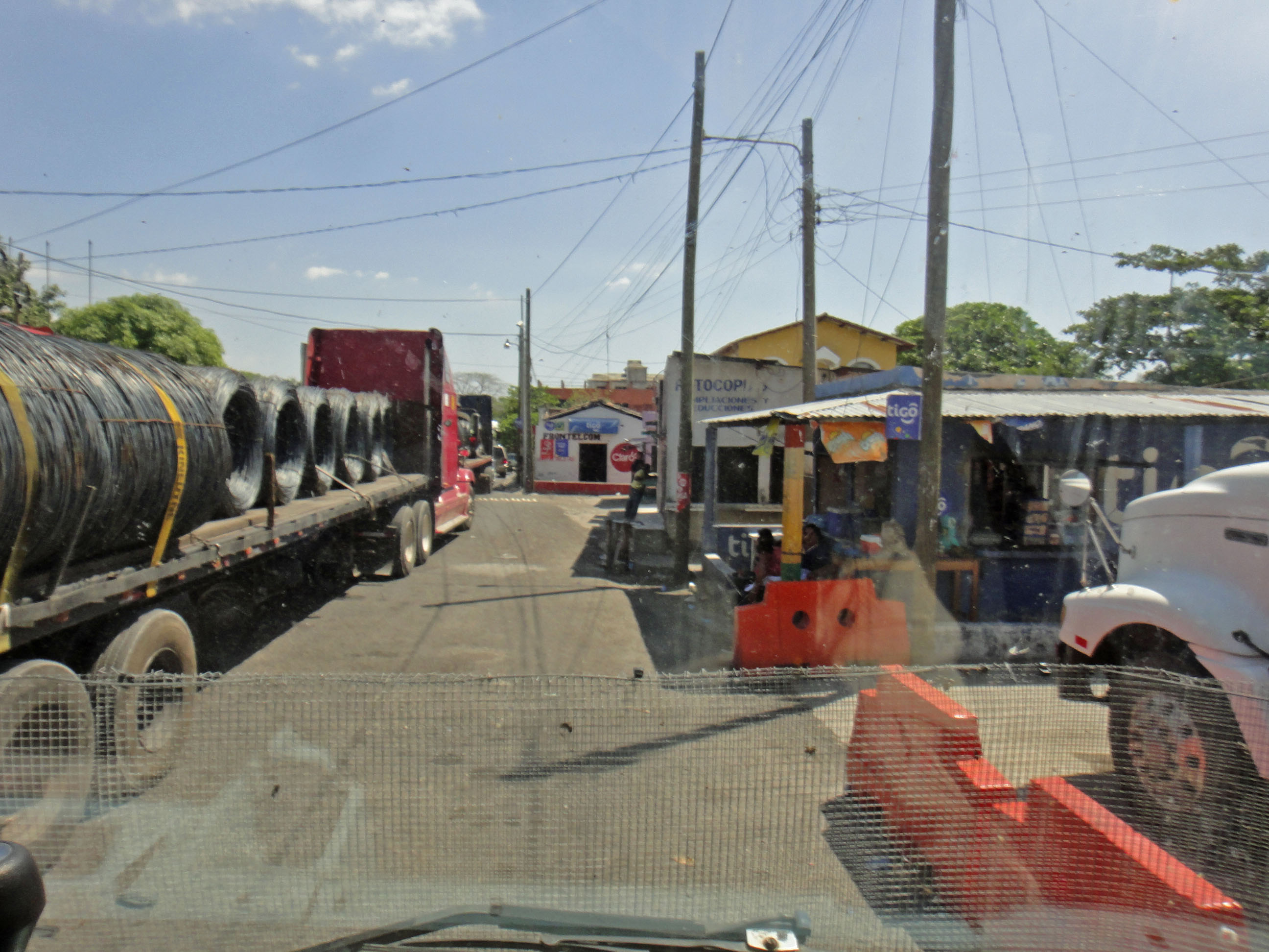 You then have to drive forward – hand a guard the original of the Import document and then there is a 2km long queue of traffic to negotiate between the Guatemalan side of the border and the El Salvadorian. This is nose to tail trucks and there was no room for us to skirt up the sides. Keep alert though because cars can weave in and out and if you let the gap with the truck in front get big enough someone will pounce!