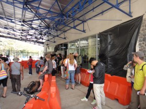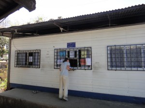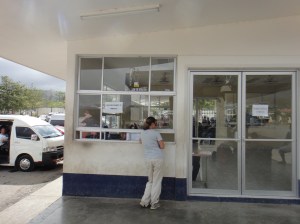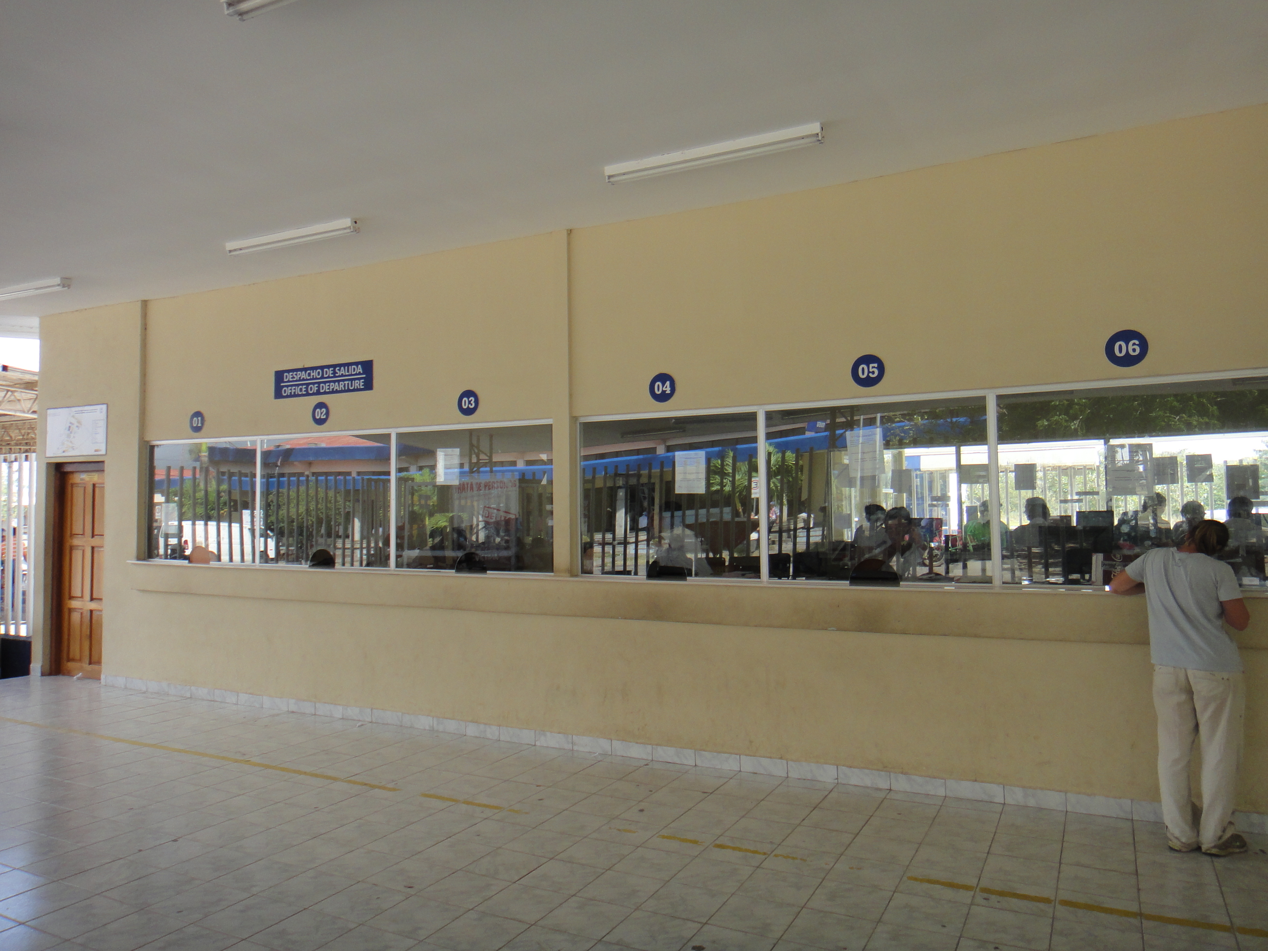 The first stop is immigration which is over the other side of the main blue and white building. There is a sign saying “Migracion”. At the entrance to immigration is a booth where you have to pay a Municipal tax of USD 1. No way of getting out of this unfortunately. After this you go to one of the windows where you fill out an exit form, pay an exit fee of USD 4 each and get your passport stamp.
