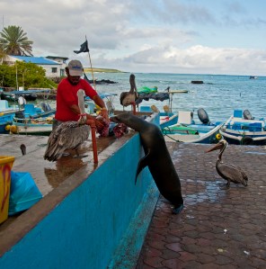 In Puerto Ayora there is a small fisherman’s dock. Each day the fishermen would cut up their catch of the day here and this attracted both pelicans and sealions. One particular sealion was a bit cheeky and was always trying to steal some fish !