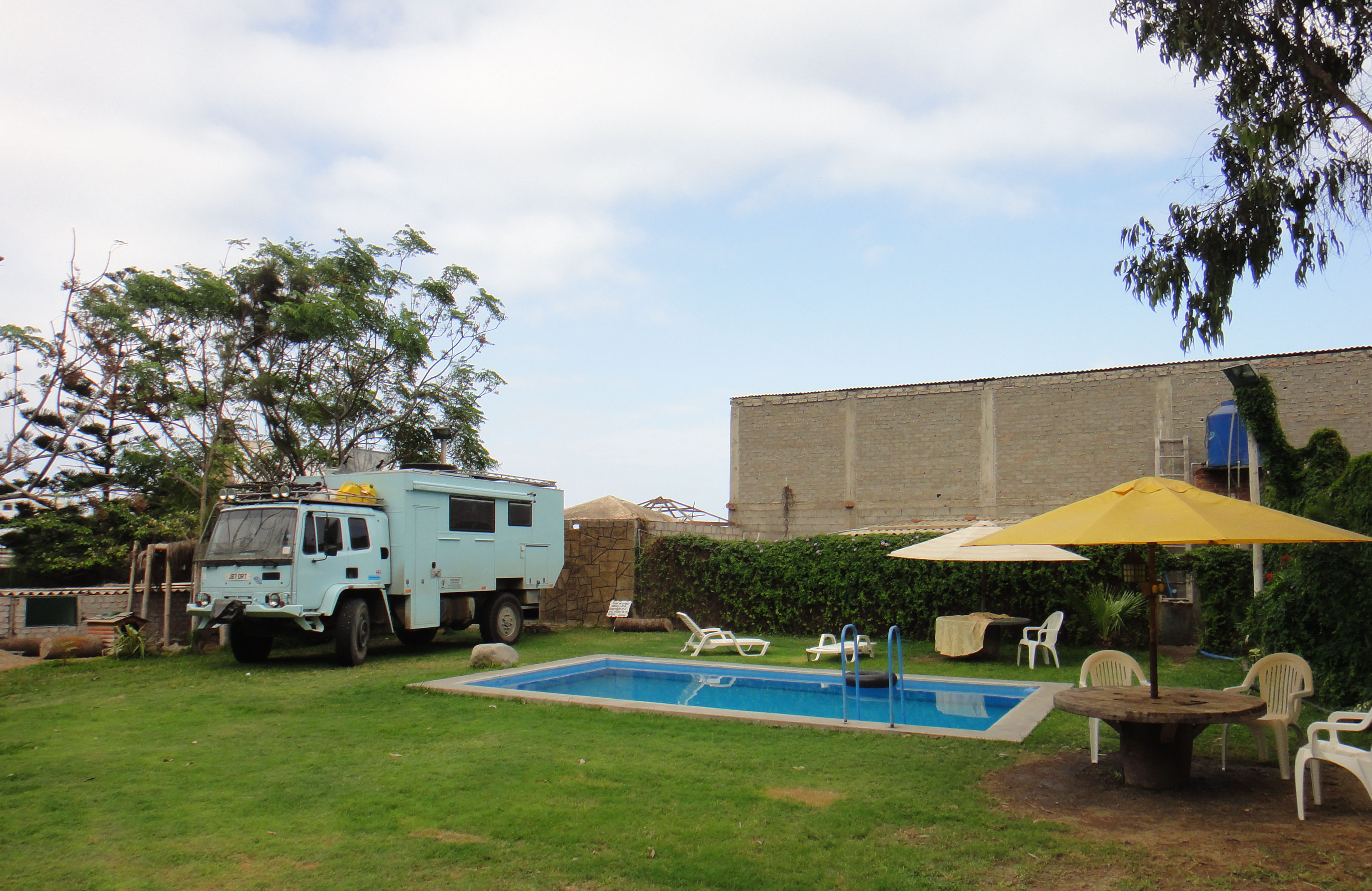 Huanchaco has one of the nicest campgrounds in Peru in a grassy lot with a swimming pool behind the Huanchaco Gardens Hotel. There were 2 peacocks living right by where we were parked and we got used to peacocks under our truck ! On arriving we were surprised to find three other sets of overlanders there. After we had been there a day another overlander arrived, this time someone that we had met about 6 months earlier in Mexico.