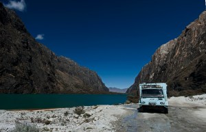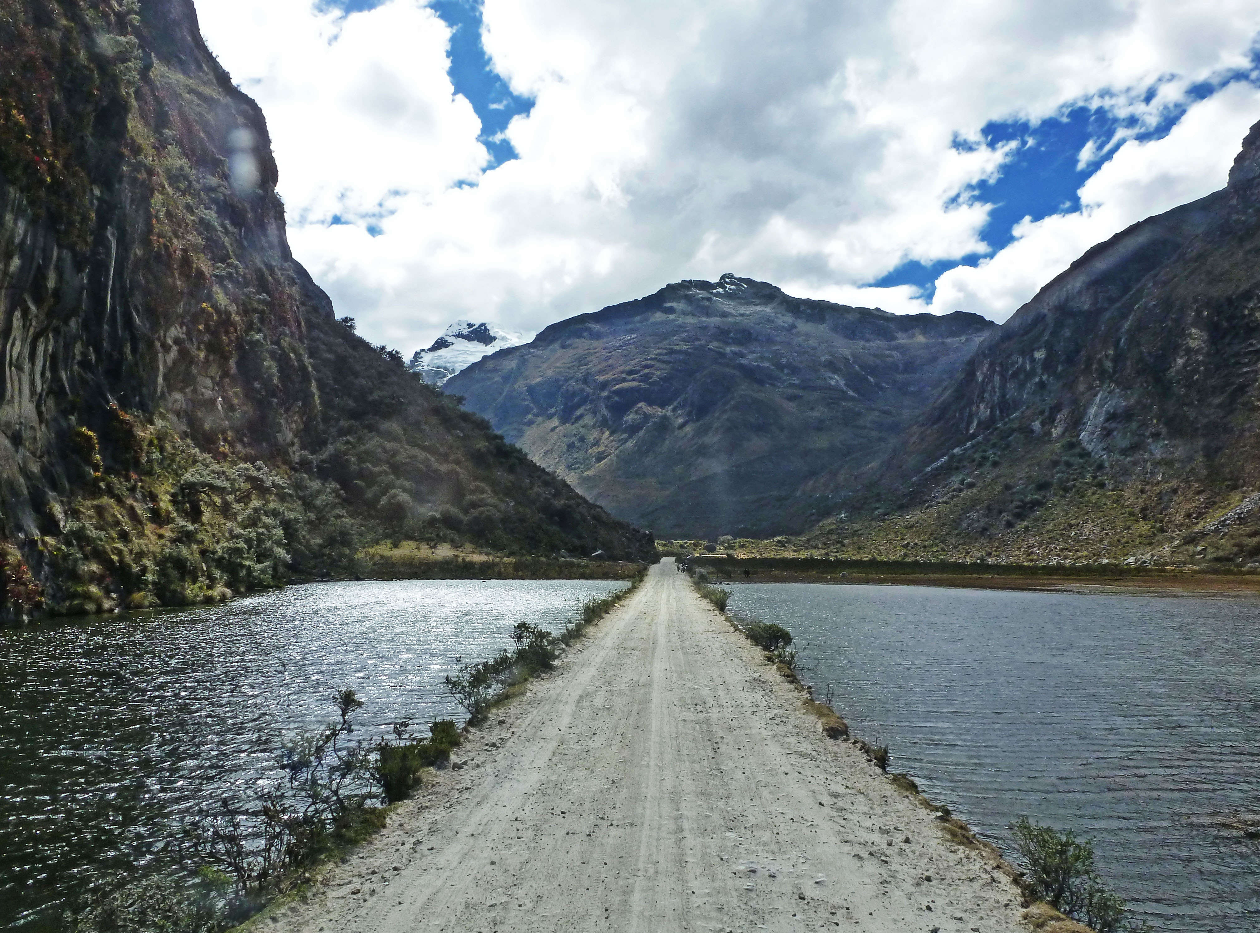 One of the top destinations in the area is the Llanganuco lakes. These are three high altitude lakes on a pass across the mountains. The road to the lakes leaves from Yungay which is between Caraz and Huaraz. The road itself is not challenging as it is a wide gravel road with plenty of room for passing but it is in bad shape and a pretty rough surface. There is also a surprisingly large amount of traffic on the road.