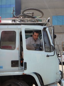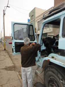 After stopping for the night in a petrol station we drove into Lima early in the morning and as luck would have it about 30km outside town noticed a building with three DAF trucks parked outside. We screeched to a halt and went to investigate. This was DAF’s Peruvian dealer and they could help us. But of course after the repairs manager was on the phone for half an hour he worked out that there was no replacement window in Peru.