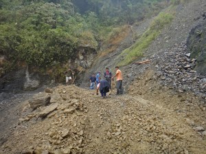On the way through the cloudforest we saw that the heavy rain the day before had made a difference and we were lucky to overtake a truck just before fallen rocks that would have blocked him and anyone behind him. A while after this we reached a large line of trucks that were stopped by a landslide that had happened the day before.  People were digging at the landslide to try to create a path through. After getting am shovel and helping with the digging our driver told us all to get out of the mini-van, took a run up and flew over the obstruction. I told you he was crazy.