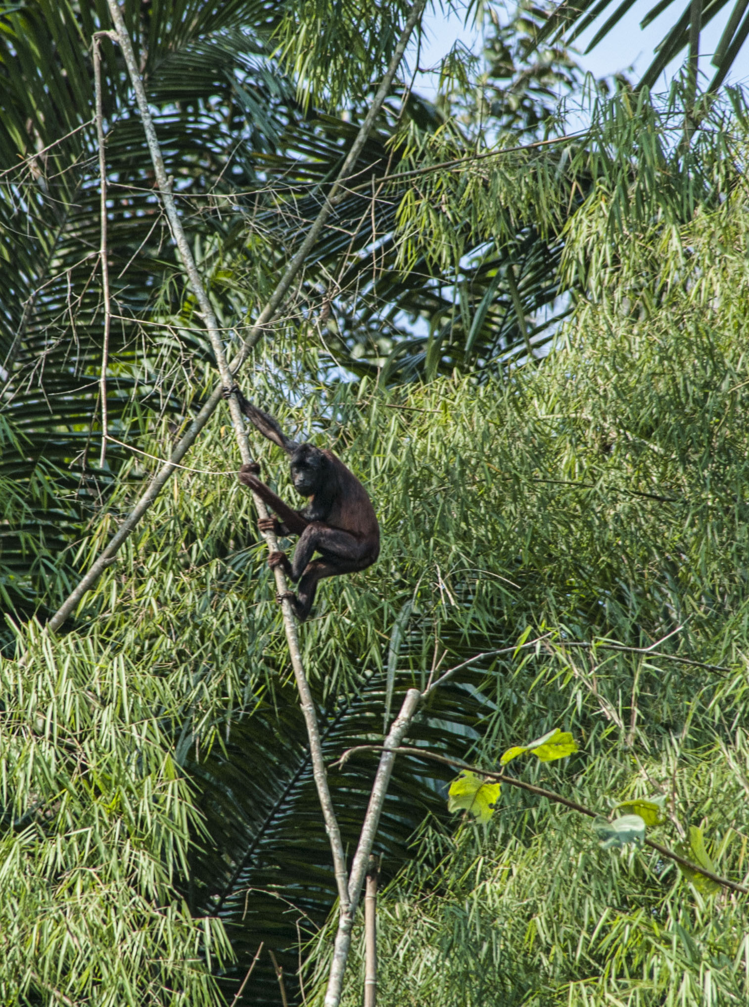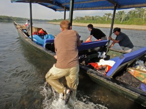 And then the river changed colour, started to swell and rose dramatically – it was raining in the cloudforest. That was the end of pushing but meant that some of the rapids took full power to navigate and we slowed to less than walking pace. There was some drama when the engine failed but there was a spare on board and the boatmen managed to change it in midstream !