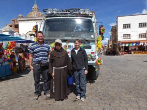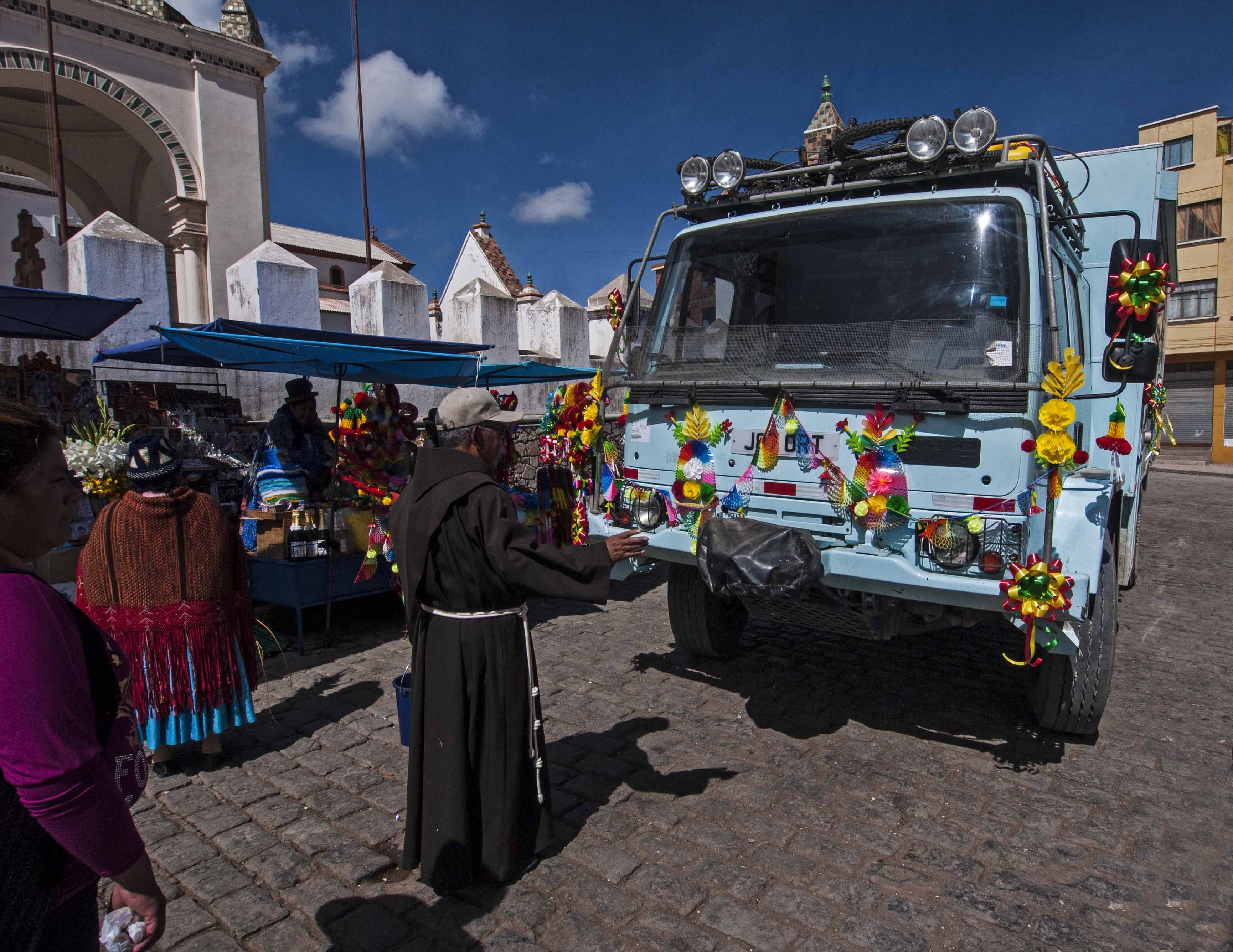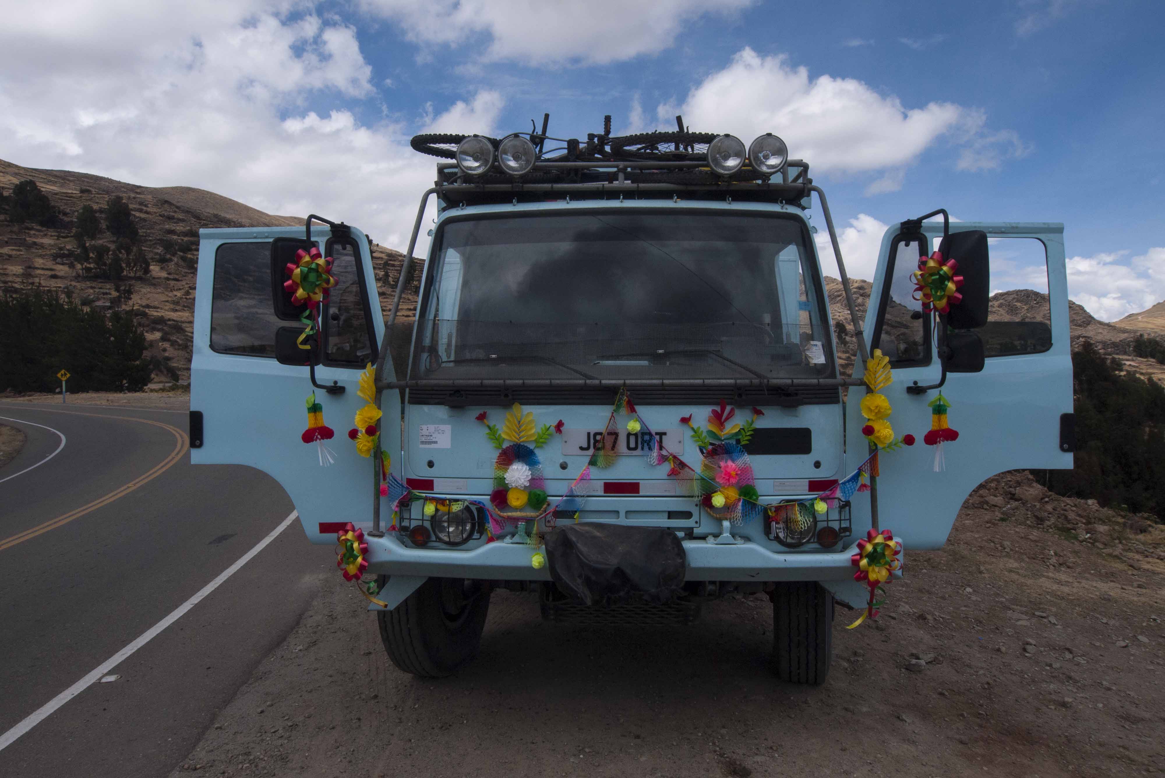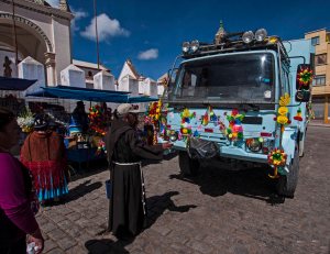 We couldn’t resist getting the Beast blessed. This is known as Ch’alla The first stage is to dress your vehicle up with fancy decorations. In the square outside the cathedral are a number of stalls run by indigenous women who gleefully decorated our truck with colourful rosettes and plastic flowers.