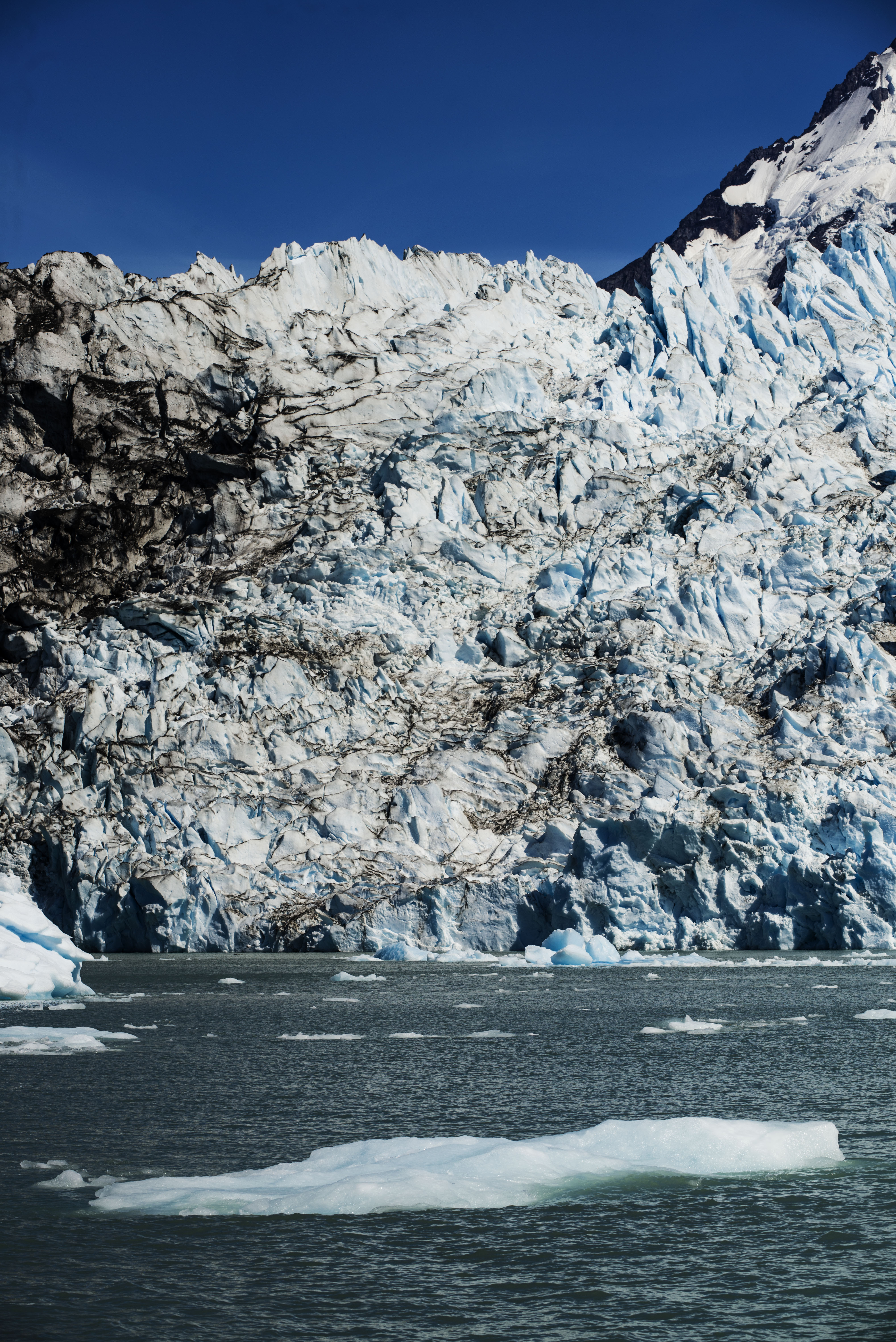 As soon as we got going all the Argentinians rushed outside to get pictures of each other on the bow but the cold wind soon drove them indoors so we were left on the prow alone. The first glacier we were visiting was Upsala which is the biggest glacier in South America (60km long and 4km wide with a surface area of 595 sq. km). As soon as we turned down the arm of the lake holding the glacier we started having to dodge small icebergs that became bigger and bigger as we got closer to the face of the glacier.