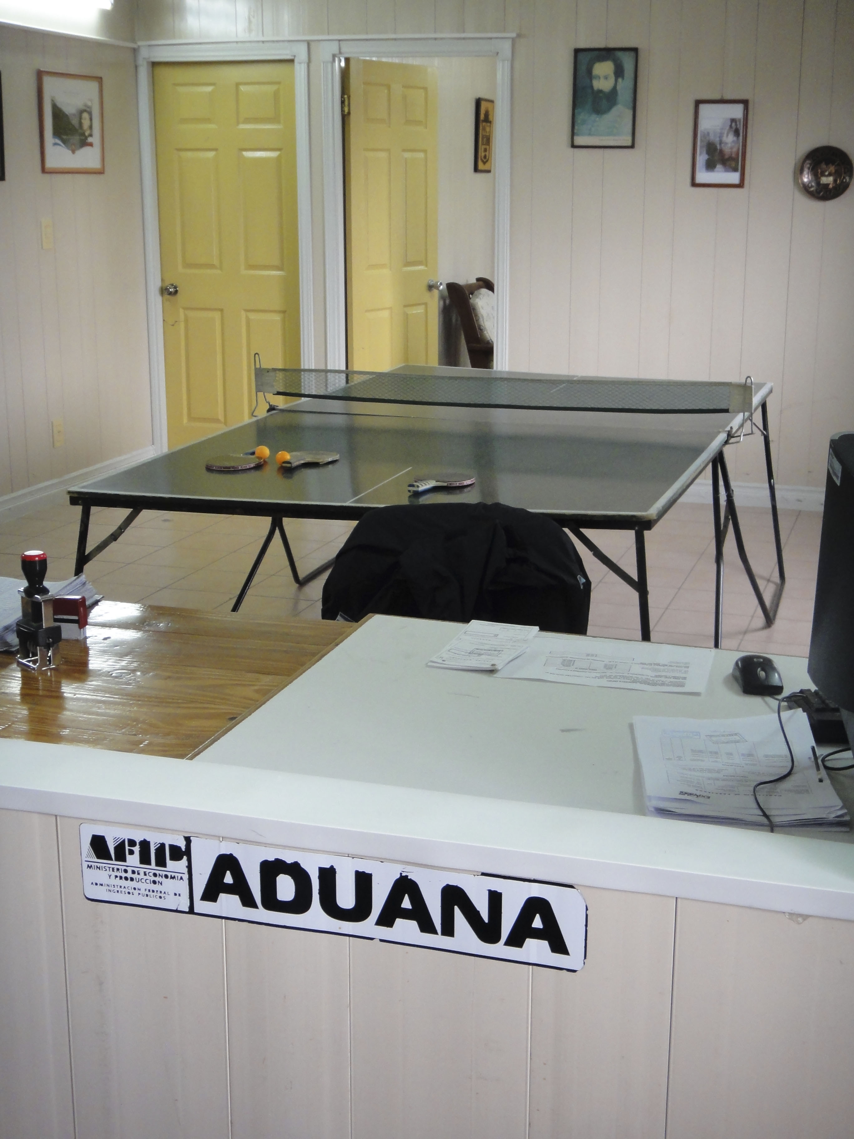 The inside of the tiny border post was incredibly crowded. There is one window for Migracion and another for Aduana. We thought it was quite funny that the Aduana window looked onto a large room with a table tennis table in it – guess these guys need to keep entertained somehow !