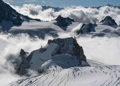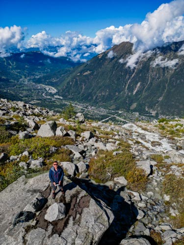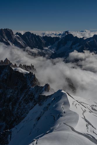 The north side of the Chamonix valley is accessed by a large modern gondola called the Aiguille du Midi. This is the really dramatic side of the valley with the biggest mountains including Mt Blanc which at 4,809m is a giant (for Europe) and the second most prominent peak in Europe. All of the glaciers – which are such a prominent feature of the Chamonix valley – are on this side (facing North).
