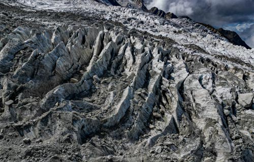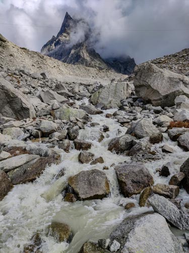 Turning in the other direction from the gondola, there is a path leading under a small glacier and its moraines and then up the mountainside to a disused cable car station. The old route runs across the glacier and involves climbing the moraines. This is no longer used and is very dangerous as the moraines are very unstable. I made the mistake of returning this way and am very grateful that I managed to exit unhurt. Don’t be foolhardy like me, the path around is the safe way to do this.