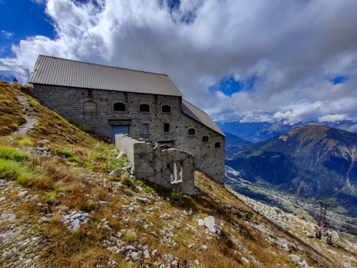 There is a glacial river to cross which is possible with a couple of jumps from rock to rock but the river runs fast and this is not a place to slip. The cable car is the Gare des Glaciers which was built for the Olympics in 1924 and was taken out of operation in 1951.