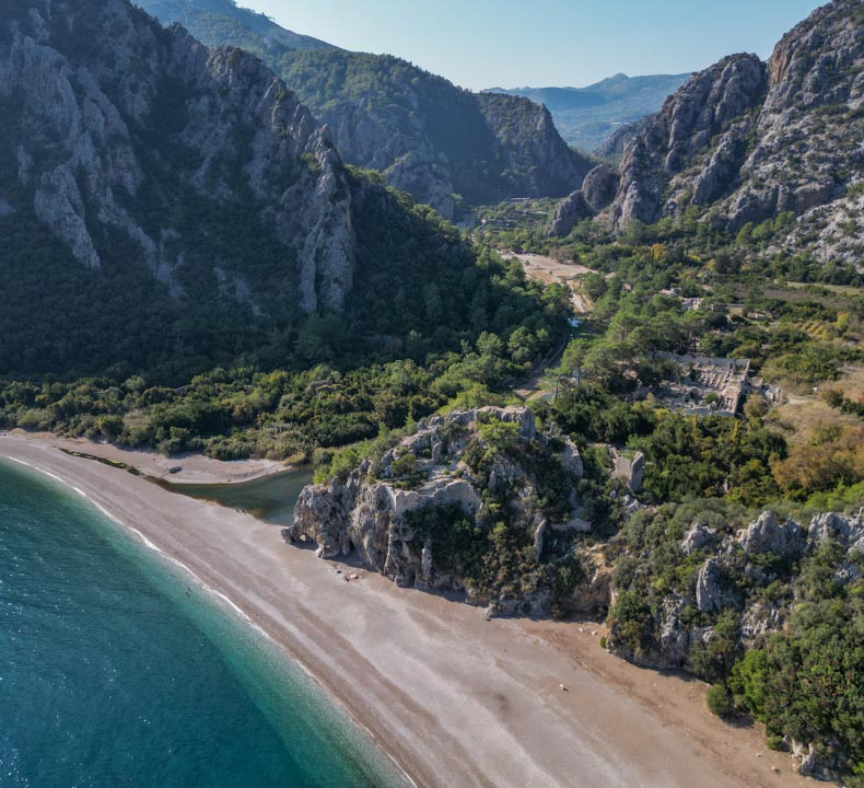 At one end of the beach is the Lycian city of Olympos and the up the hill side at the other end are the eternal flames of Chimaera.