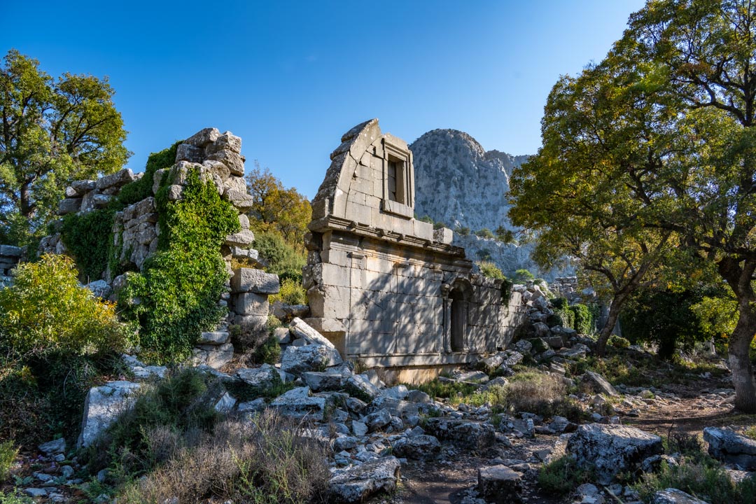 About 1 km down the beach from Cirali is a river mouth and around this is the Lycian city of Olympos which stretches up the river from the sea. Much of the city has been uncovered but there is much more that can be found on exploring the valley through the undergrowth.