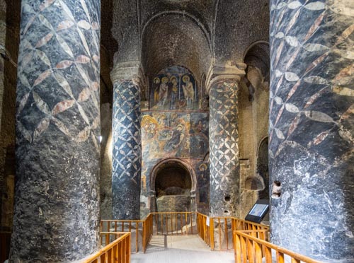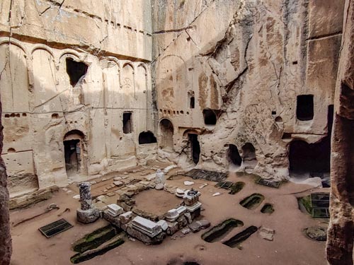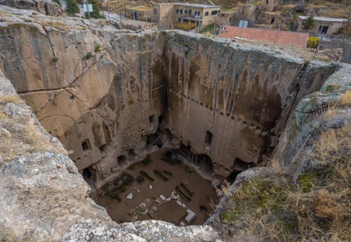 Our first stop was right at the edge of the Cappadocia region to a little visited monastery called the Gümüşler Monastery. The monastery is hidden behind the rock face of a small cliff, peppered with cave dwellings along its full length. Once through the door you emerge into a square courtyard which is open to the sky and surrounded by carved walls on each side. Behind the walls are rooms and an ornate church.