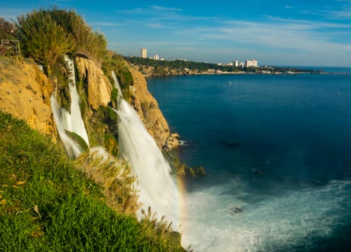 We had time to spare on reaching Antalya so we stopped off at Duden Park to see the Lower Duden Falls which flows into the sea. As it was a sunny Sunday afternoon the park was full of families enjoying their day off. We had a lovely lunch at a restaurant in the Park and enjoyed watching one of the waitresses repeatedly trying to chase off three friendly stray dogs to no avail, eventually giving in and taking them a plate of food.