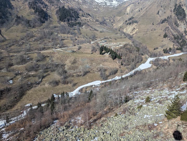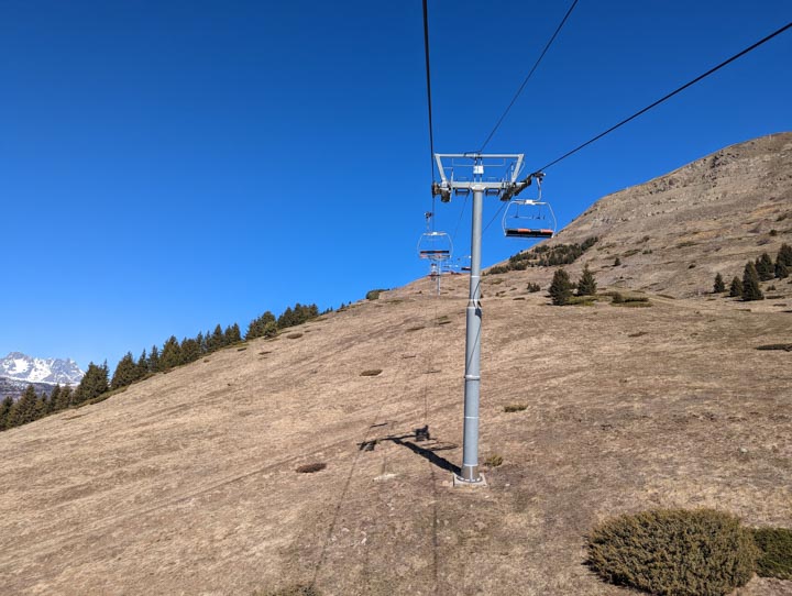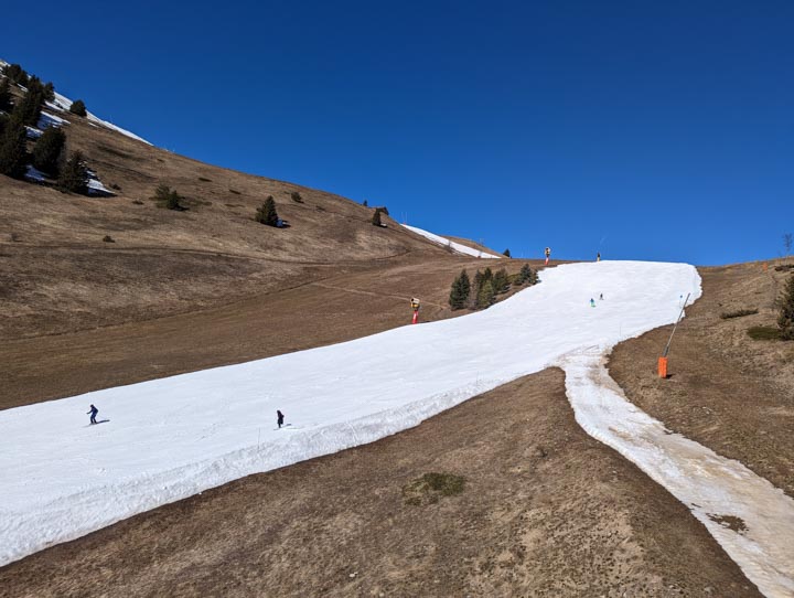 The impact of this weather, with highs of 14C (the highest temperature I have seen while skiing in February), means that a lot of the snow cover from earlier in the season is melting. The pisteurs have been doing an amazing job at keeping the pistes in good shape but despite this, some of the lower slopes are now closed, several of them are surrounded by exposed grass and those that are open are becoming narrower by the day. Having said that, it is still possible to ski down to the lower lying towns of the ski area, it’s just that the ski conditions are what you might expect towards the end of the season, not at its peak.