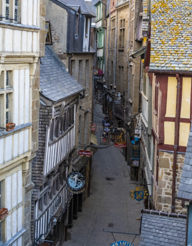 The main gate to the island is at sea level and the narrow, cobbled Grande Rue leads uphill to the Abbey. The street is lined with medieval buildings, now mostly housing restaurants and gift shops, and sweeps past a small church dedicated to St Michel.
