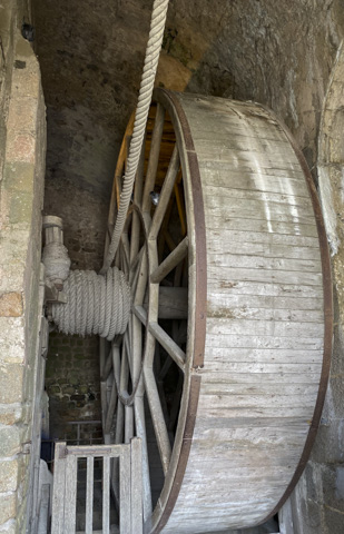 The large wooden wheel and pulley was a relatively new addition, only added in 1820 when the Abbey was turned into a prison. It was used like a hamster wheel with four prisoners walking two abreast inside the wheel in order to hoist up supplies from the bottom of the island.