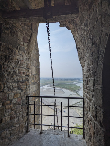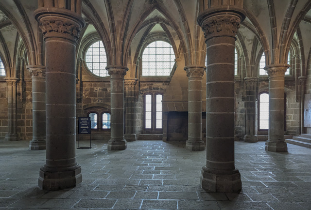 Mont-St-Michel is a small rocky island in a bay on the North coast of Normandy. It has been built up with an Abbey at the top and high walls around the perimeter. The crypts built under the abbey were designed to support the weight of the church itself at the top of the island. It was connected to the mainland by a causeway (built in 1878) that flooded at high tide but over the years sand and silt threatened to turn the island into a peninsula so this was replaced by a bridge in 2014.