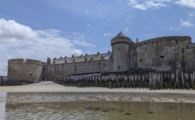 From Hirel we headed to the port city of St-Malo. St Malo has one of the broadest tidal ranges in the world and our visit was during low tide so we missed the spectacle of waves crashing against the walls but instead we were able to walk around the broad sandy beaches below the walls.