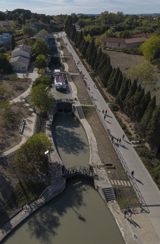 Just outside the town, we went for a very pretty cycle over the Orb Aqueduct and along the canal du Midi, which has a famous sequence of eight locks in a row, called the Ecluses de Fonseranes, dropping the canal 21.5m down to the level of the River Orb.