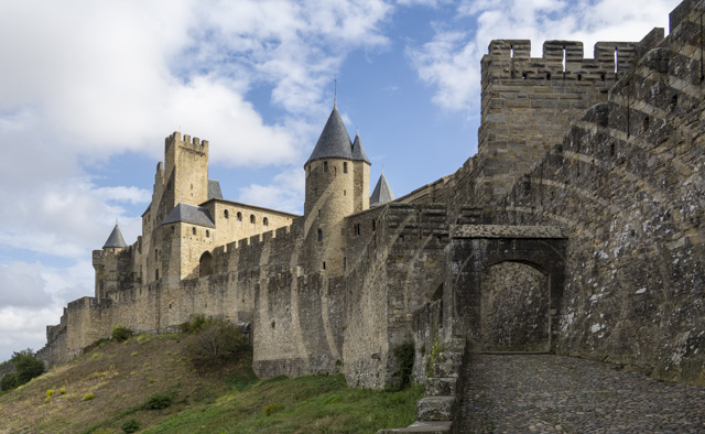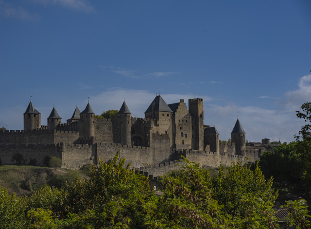 The Citadel, know as the Cite de Carcassonne, has a massive double wall surrounding it and then in the centre of the town there is another moat and wall with the inner castle inside. There are 52 stone towers in the outer walls, many with the witches-hat roofs that were added as part of the 19th century restorations.