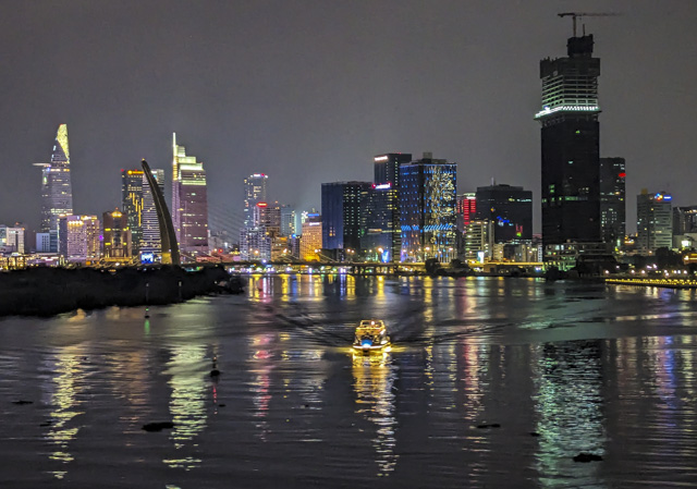 In the evening we jumped on a bus tour of the city which drove us around and gave us a great view of the skyline of Saigon. It’s a big modern city with lots of skyscrapers. At night they are all lit up with many having lightshows on their exteriors.