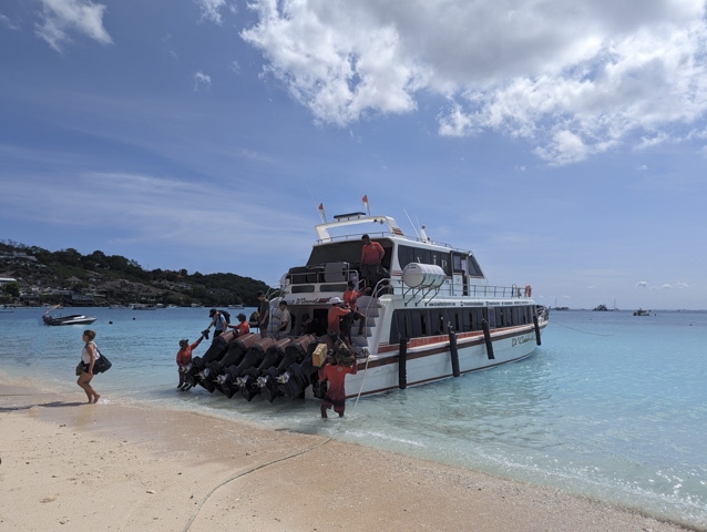 To our surprise we realised there was no dock here and we were going to land on the beach. The boat pulled up as close as it could to the shore and we all clambered down off the back with the waves breaking beneath us. With the rough weather, we had to time the climb down with the waves to avoid a soaking but even so, we both ended up quite wet and this is the side of the island protected by a barrier reef. It’s all part of the fun though and when it’s this warm you dry off pretty quickly!
