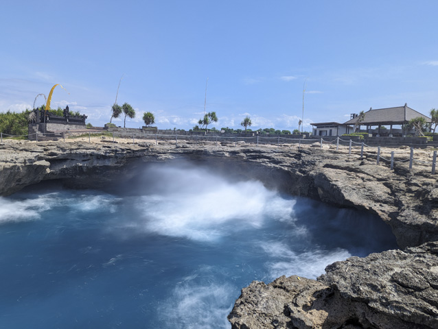 As we sat at a table close to the edge watching the surfers, a giant wave crashed against the cliff and drenched us – we weren’t having a lot of luck staying dry today! Having moved tables, we stayed for a leisurely lunch to dry off once again, before heading back to discover more of Lembongan.