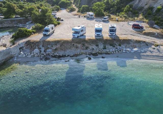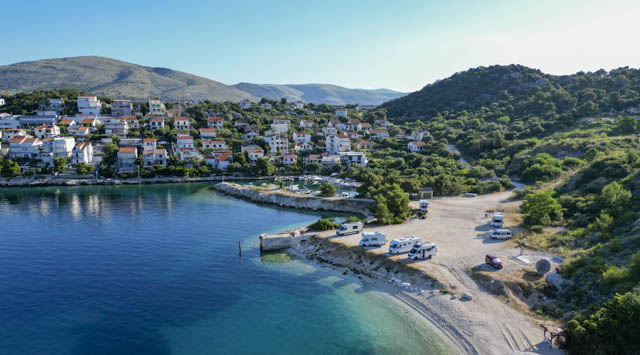 We had thought about staying here for a couple of days but the campsite was a bit busy for our liking and we felt a bit packed in like sardines. So we decided to move on in the morning and head for the island of Ciovo, where we had heard about a free park-up by a small beach. After following some narrow roads through the main town, we arrived at the parking area, right on the water and next to a small harbour.