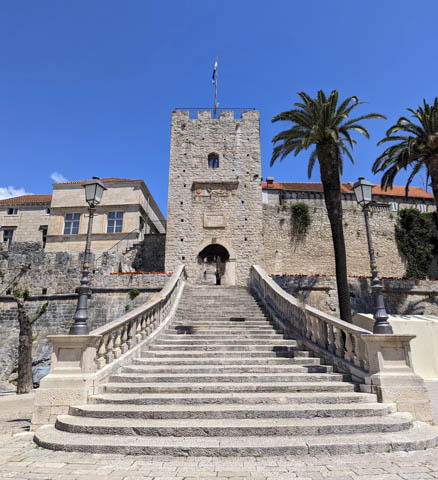 One of the reasons for coming here is that we wanted to take a day trip across to visit Korcula, which you can do from Orebic. The ferry only takes 20 minutes and you can travel across with vehicles, so we cycled the 5kms from the campsite to Orebic and after the short ferry ride, had another 3km cycle to get from the harbour to Korcula town. For foot passengers there are smaller ferries that dock in Korcula town harbour itself.