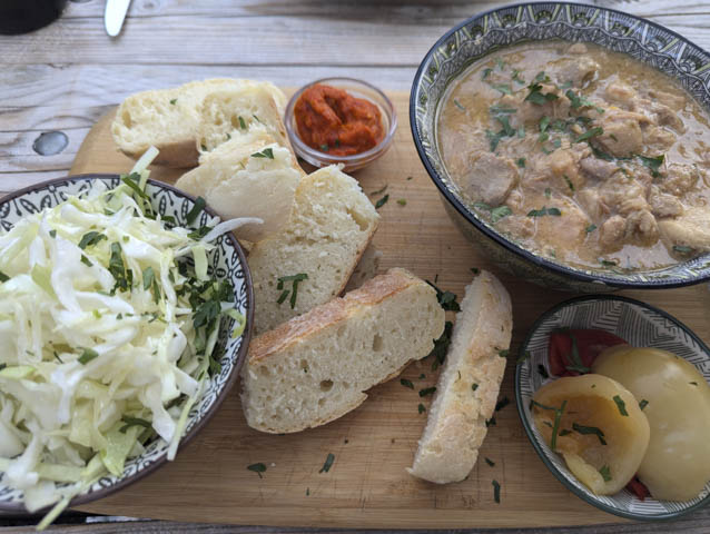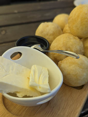 One of the things that makes this a good stop over (other than the free toilets) is the bar/restaurant on site. It would of course have been remiss of us not to enjoy a local beer and try a local specialty – fried dough balls with hard cheese and honey on the side. These were not quite what we had expected (think Pizza Express garlic dough balls – yum), and I can’t say that we enjoyed them, but it was interesting to try them none the less.