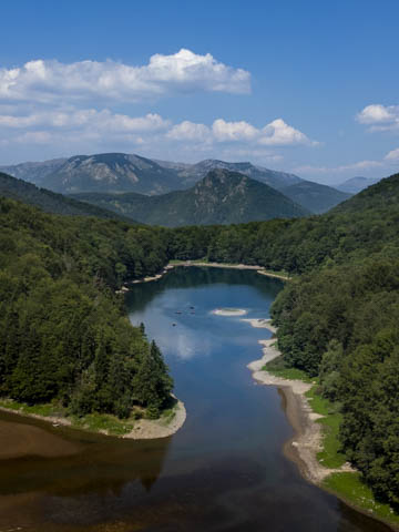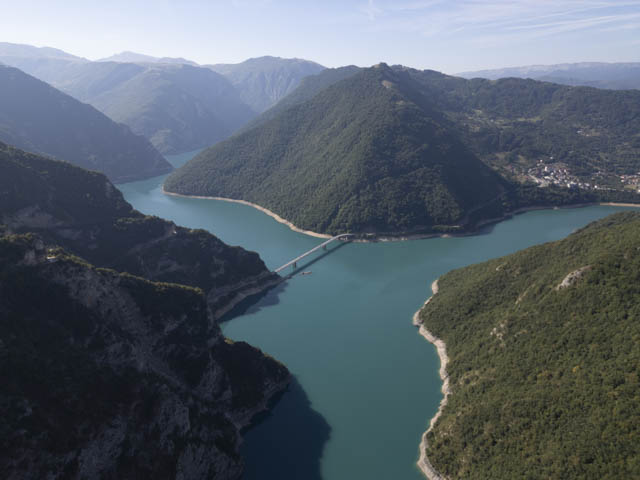 Once through the mountains of the National Park, the road starts to descend through some farm land and then, as you turn a corner, there is another wow moment when you first glimpse the aquamarine Piva Lake far below.
