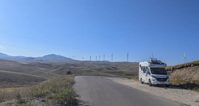We actually headed in a big loop back up towards Durmitor National Park although that hadn’t been the original plan, or even the back-up plan. We were heading for a mountain lake above the town of Niksic which would have made a great place to stay the night. We turned off the main road and drove up and over a high plateau studded with wind turbines, past a remote farming village, until we reached a tiny ski resort that looked very run down and abandoned. Just past the resort there was a barrier half way across the road which then narrowed into a gravel mountain track. At this point it was early evening so we decided to abandon the idea of finding the lake, and started to look for an alternative spot for the night.