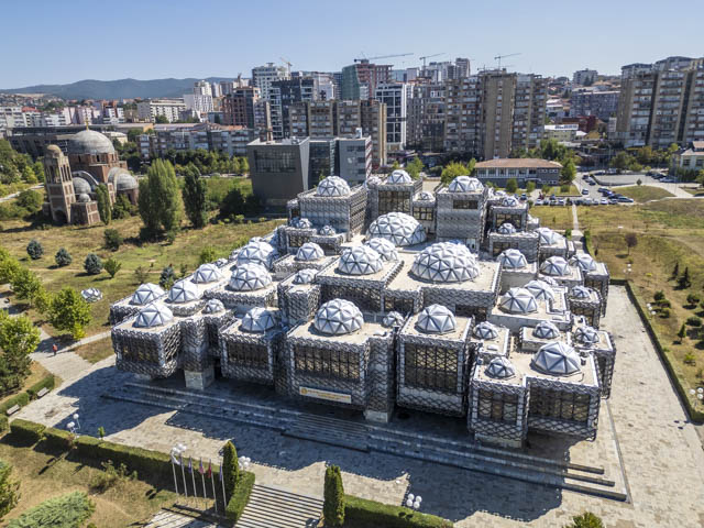 Pristina is a big city but we had no problems finding a large parking lot near the sports stadium and from there cycled around the town to all the main sights. The best of which is the view of the space-age National University Library of Kosovo building, taken from the bell tower of the Catholic Cathedral of St. Mother Teresa. It is also worth going into the library as the main atrium is quite impressive.